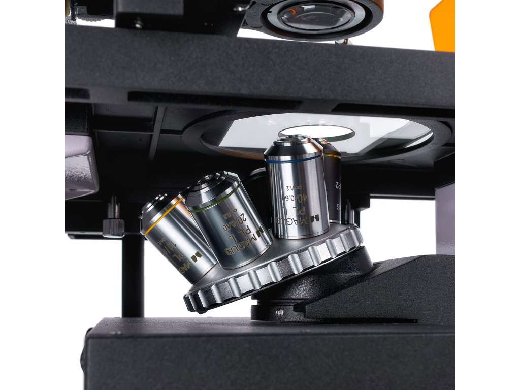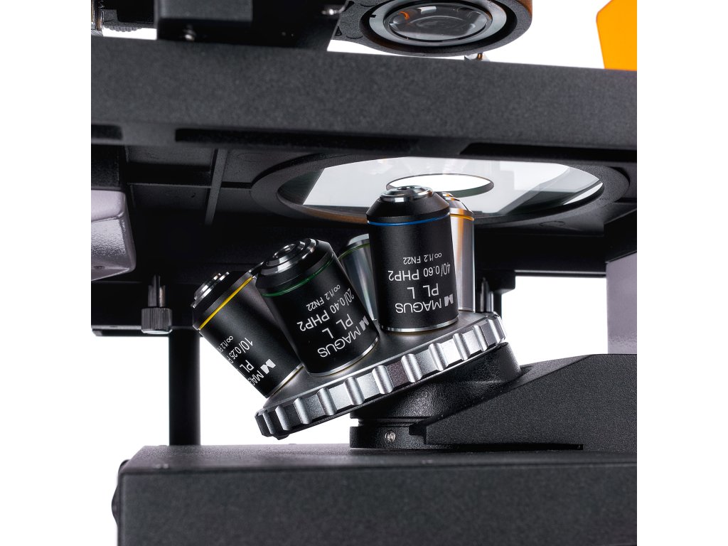 Sada obsahuje šest rovinných achromatických objektivů: tři z nich pro mikroskopii ve světlém poli a fluorescenční mikroskopii, další tři pro mikroskopii s fázovým kontrastem. Tyto objektivy disponují korekcí na nekonečno a mají dlouhou pracovní vzdálenost. Revolverový nosič má šest slotů pro montáž objektivů. Revolverový nosič je umístěn na stojanu pod pracovním stolkem.