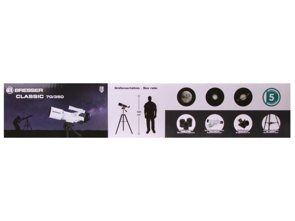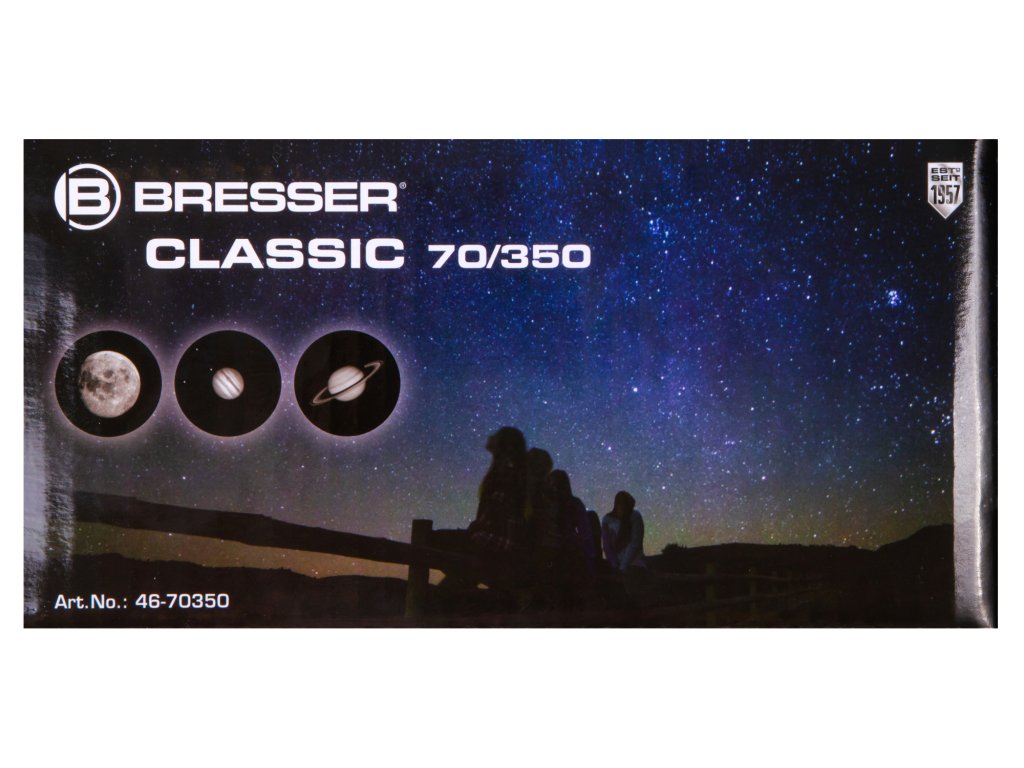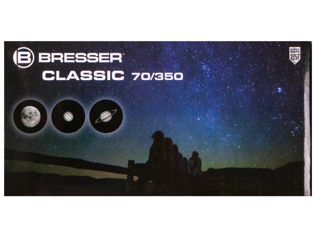 Teleskop Bresser Classic 70/350 AZ je citlivý kompaktní čočkový dalekohled určený pro sledování oblohy, pozorování krajiny a života v divoké přírodě. Velmi jednoduše se nastavuje i ovládá a je i snadno přenosný. Jedná se o ideální volbu pro všechny milovníky přírody, kteří hledají výkonný dalekohled nabízející jasný a ostrý obraz. Tento teleskop je ideální nejen k cestování. Bresser Classic 70/350 AZ se z výroby dodává s 90° vzpřimovacím hranolem (1,25"/ 31,7 mm), který umožňuje získat „správný“ vzpřímený obraz. Teleskopický tubus je nesen pevným polním stativem, který je výškově nastavitelný od 73 do 160 cm a pozorování je díky němu ještě pohodlnější.