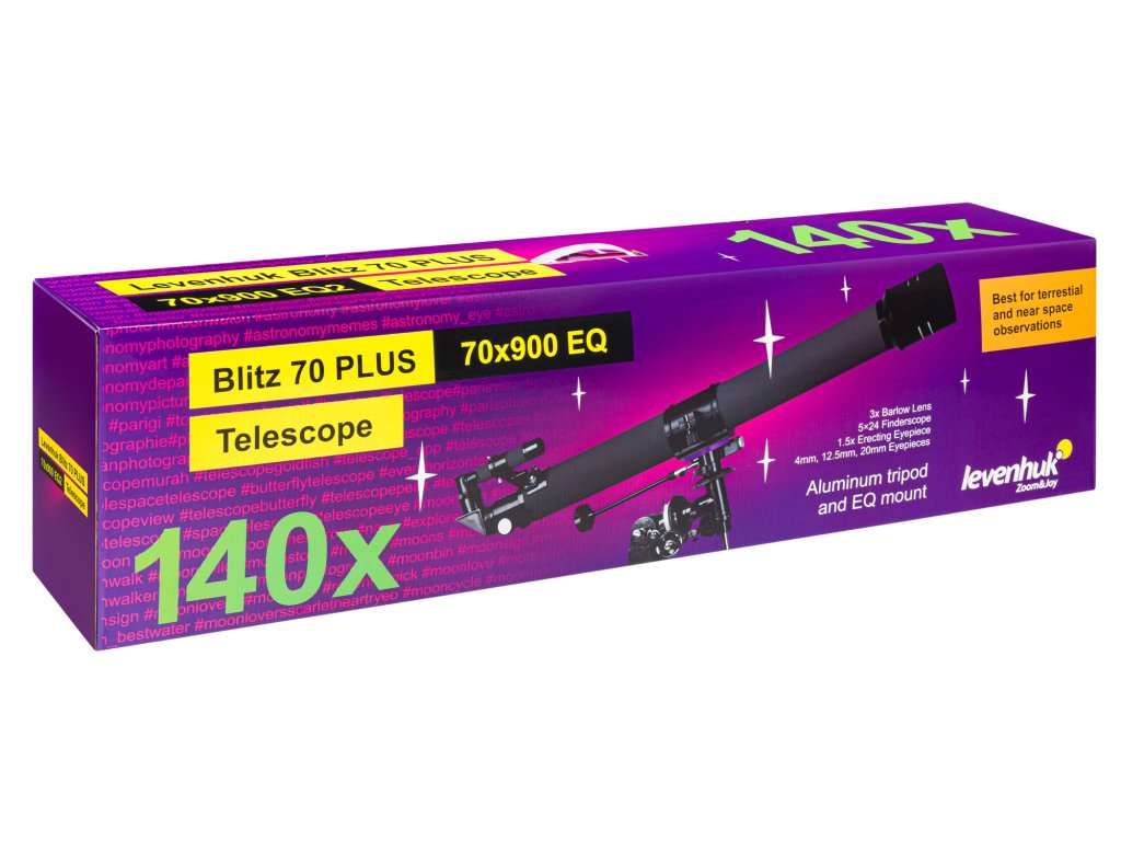 Achromatický refraktor Levenhuk Blitz 70 PLUS je skvělou volbou pro začínající astronomy. Umožňuje pozorování planet Sluneční soustavy včetně jejich satelitů, některých objektů hlubokého vesmíru a detailně také Měsíc. Tento teleskop lze použít i k pozemním pozorováním.