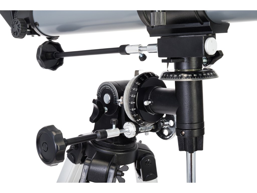 Paralaktická montáž je ovládaná ručně. K vyrovnávání se používá protizávaží. K zaostření slouží dva ovládací knoflíky s pomalým pohybem. Výška hliníkového stativu je nastavitelná. K dispozici je odkládací přihrádka na příslušenství.