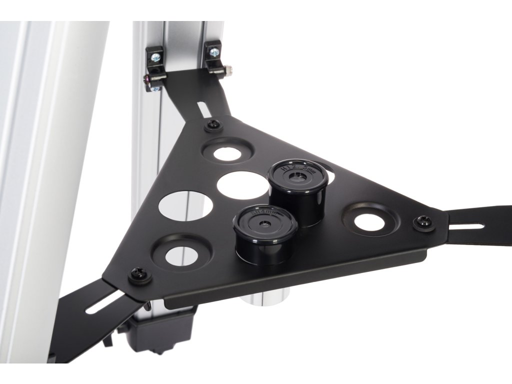 Stativ je vyroben z hliníku. Jeho nohy mají nastavitelnou výšku a uprostřed se nachází odkládací přihrádka na příslušenství.