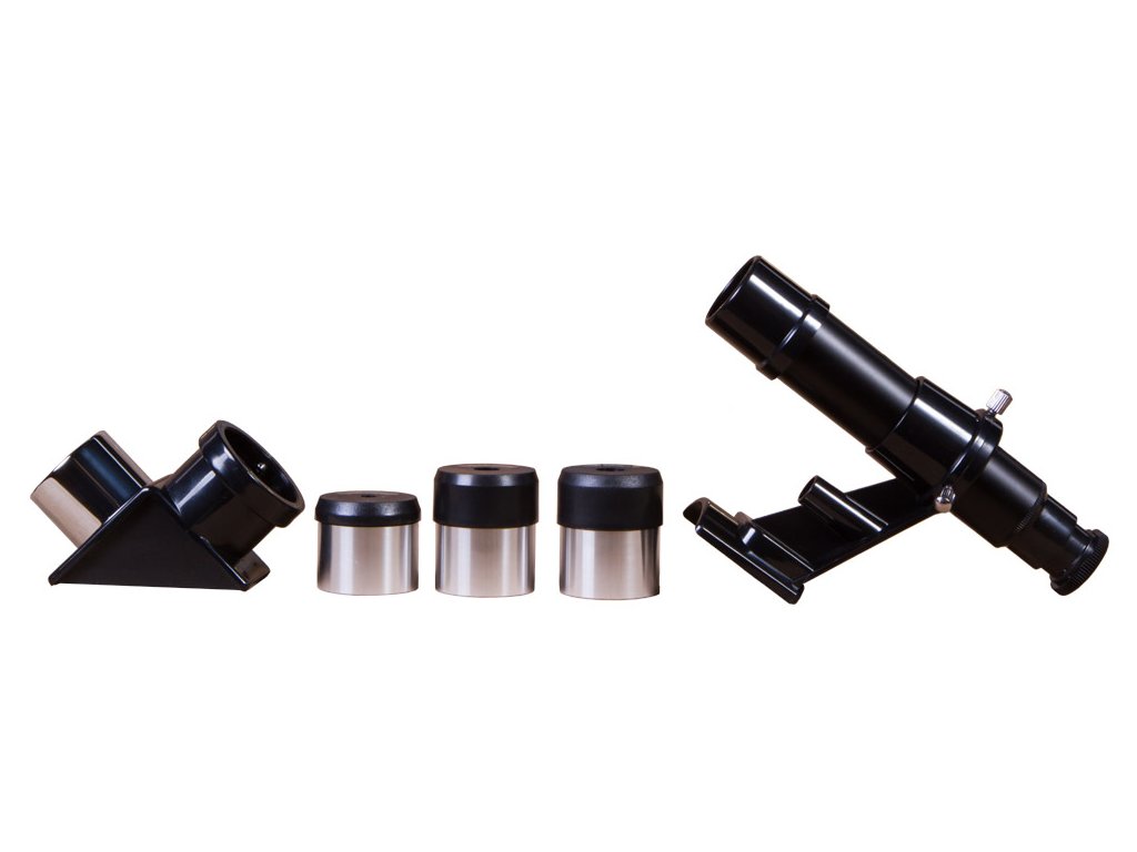 Sada obsahuje optické doplňky, které umožňují okamžité zahájení pozorování. Tři okuláry umožňují rychle zvolit optimální zvětšení pro zkoumání různých astronomických objektů, zatímco diagonální zrcátko napomáhá při pozorování pozemských objektů. Stejně jako všechny další teleskopy, teleskop Levenhuk Skyline PLUS 60T přenáší obraz obrácený vzhůru nohama, což je pro pozemské pozorování nepohodlné. Diagonální zrcátko tento stav koriguje a převádí obraz do běžné podoby.