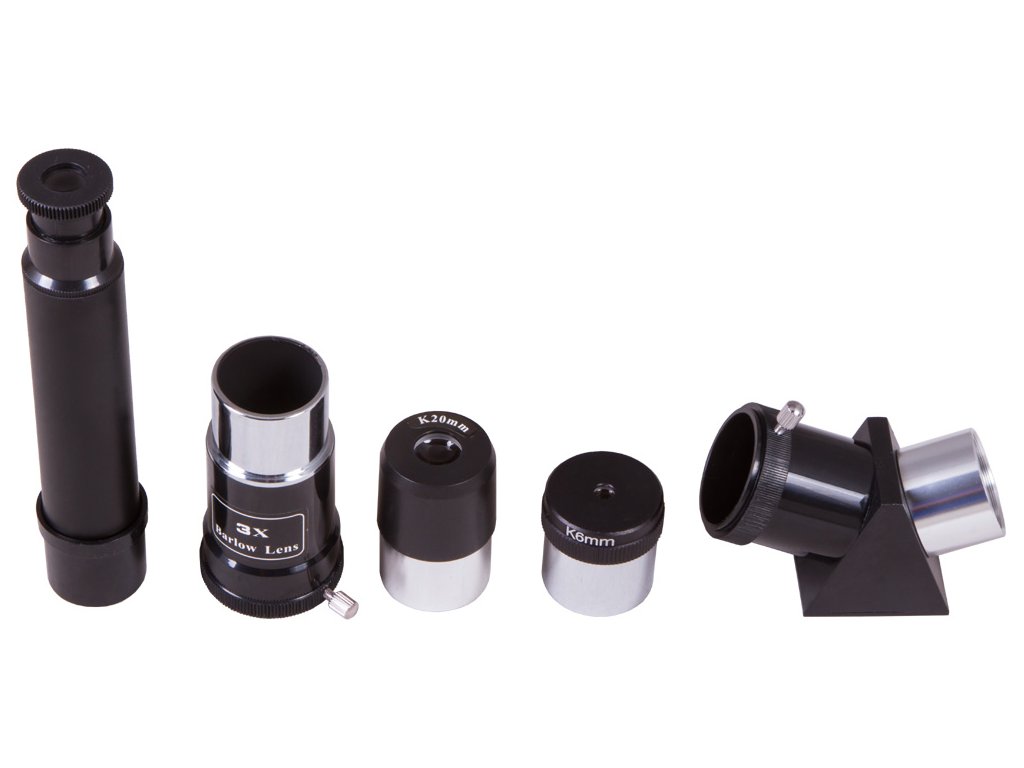 Sada obsahuje diagonální hranol, který zajišťuje vzpřímený (nezkreslený) obraz. Dalekohled je proto vhodný také pro pozorování pozemních objektů – lze jej použít jako výkonný spektiv. Sada také obsahuje okuláry 67x a 20x, Barlowovu čočku 3x a sluneční filtr. Nejvyšší užitečný výkon teleskopu je 140x. Praktický hledáček 5x24 umožňuje rychlé vyhledání pozorovaného objektivu na noční obloze. Pomocí příslušenství k okamžitému použití můžete dosáhnout 200násobného zvětšení.