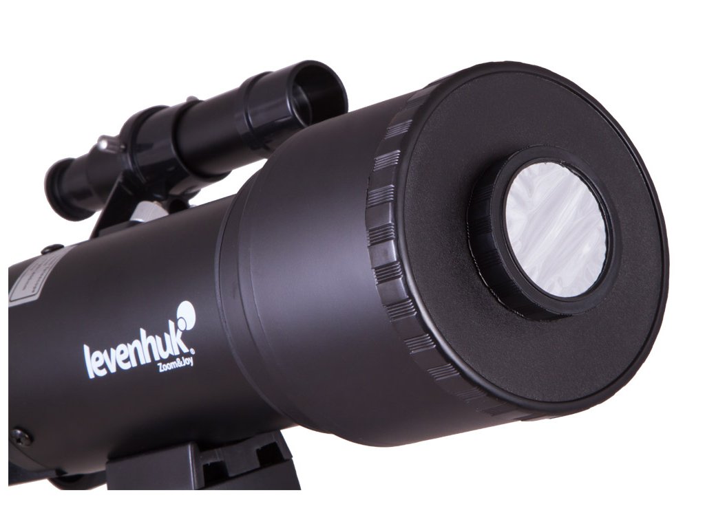 Levenhuk Skyline Travel Sun 70 je dalekohled se zkráceným a lehkým optickým tubusem. Instaluje se na azimutální montáži s ručním ovládáním. Dalekohled se pohybuje po vertikální a horizontální ose pomocí praktické rukojeti. Tento optický přístroj nevyžaduje žádné nastavení – stačí jej sestavit a můžete začít s pozorováním. Výšku hliníkového stativu lze nastavit v rozsahu od 40 do 125 cm, takže jej mohou používat astronomové bez ohledu na svou výšku.