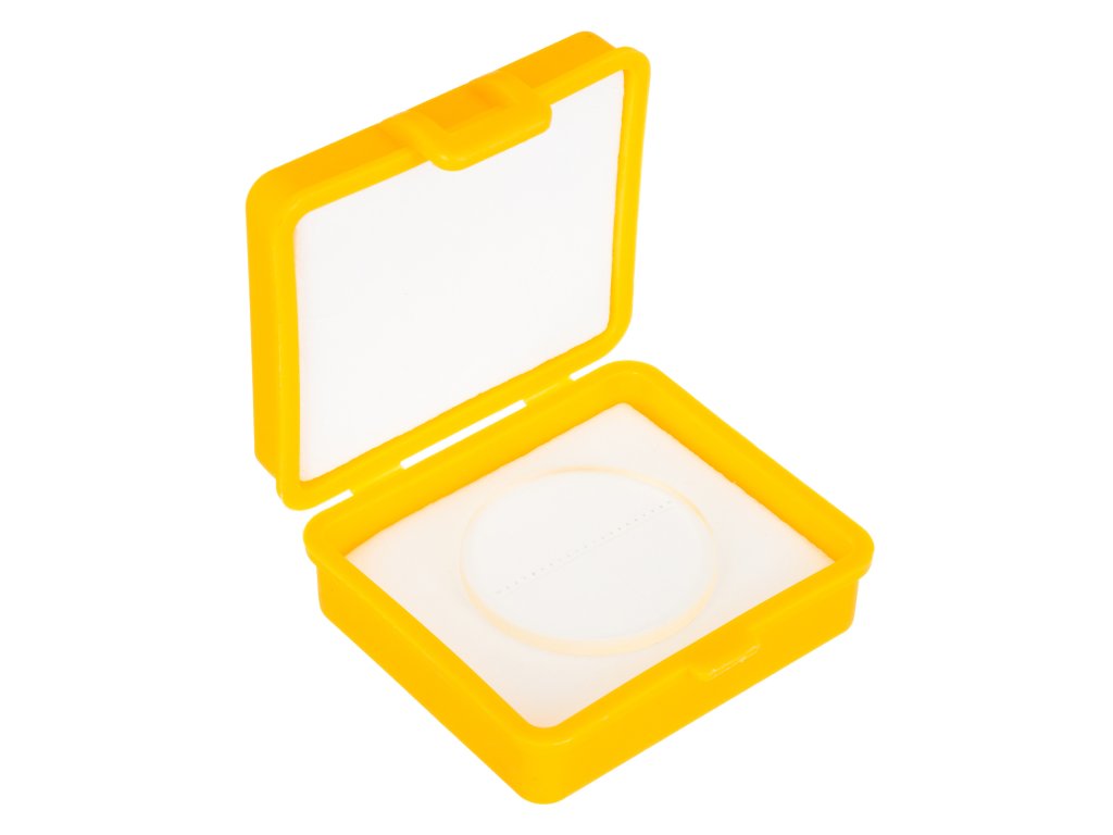Toto je kalibrační sklíčko Levenhuk 1. Je určeno pro použití na stereomikroskopech. Je vyrobeno z optického skla a má průměr 24 mm. Velikost dílků stupnice na něm činí 0,1 mm. Celkem stupnice obsahuje 200 dílků.