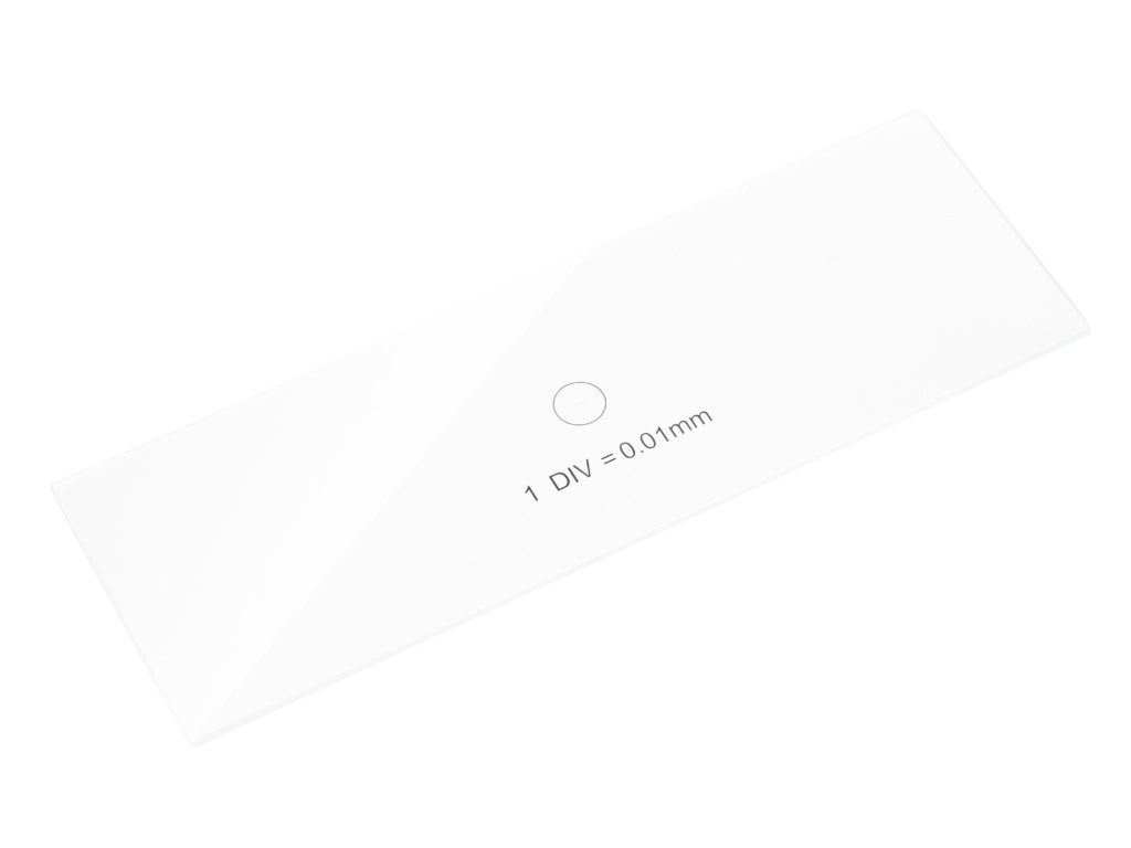 Kalibrační sklíčko Levenhuk 1 je průhledné sklo standardní velikosti s vytištěnou mikrometrickou stupnicí. Stupnice má 100 dílků a hodnota dělení je 0,01 mm.
