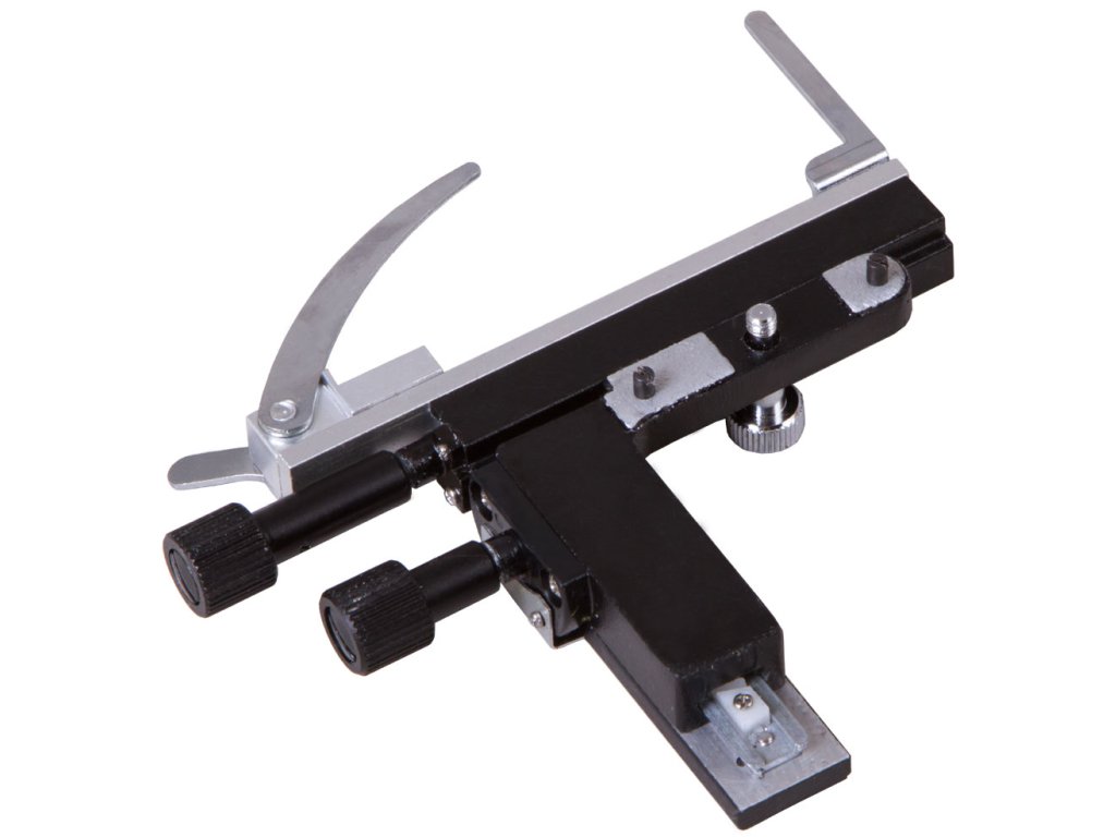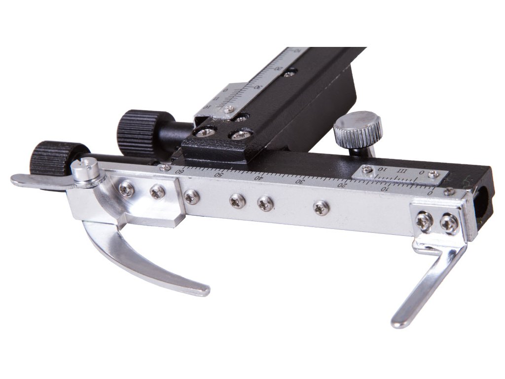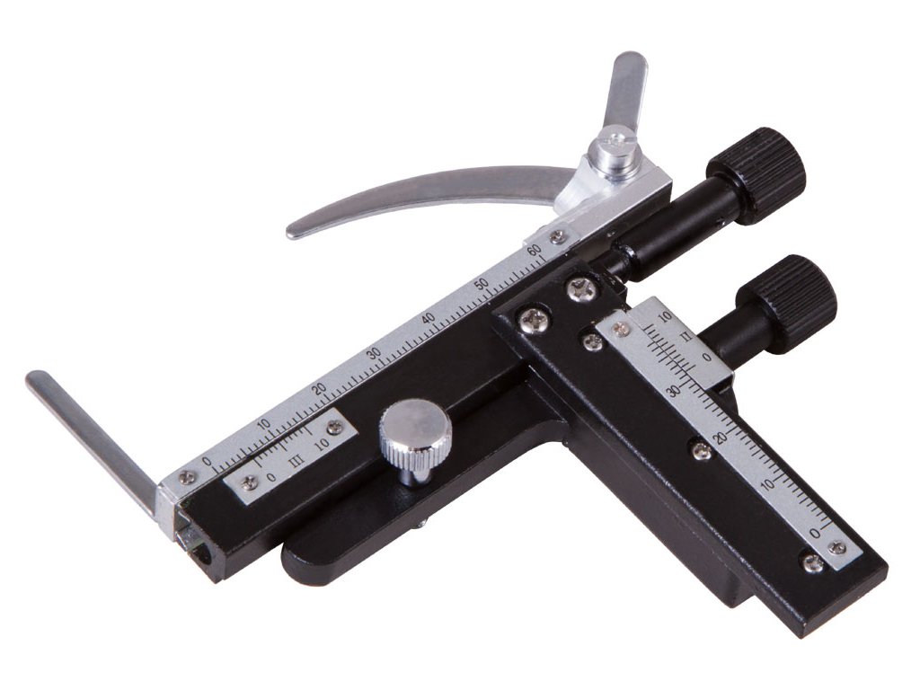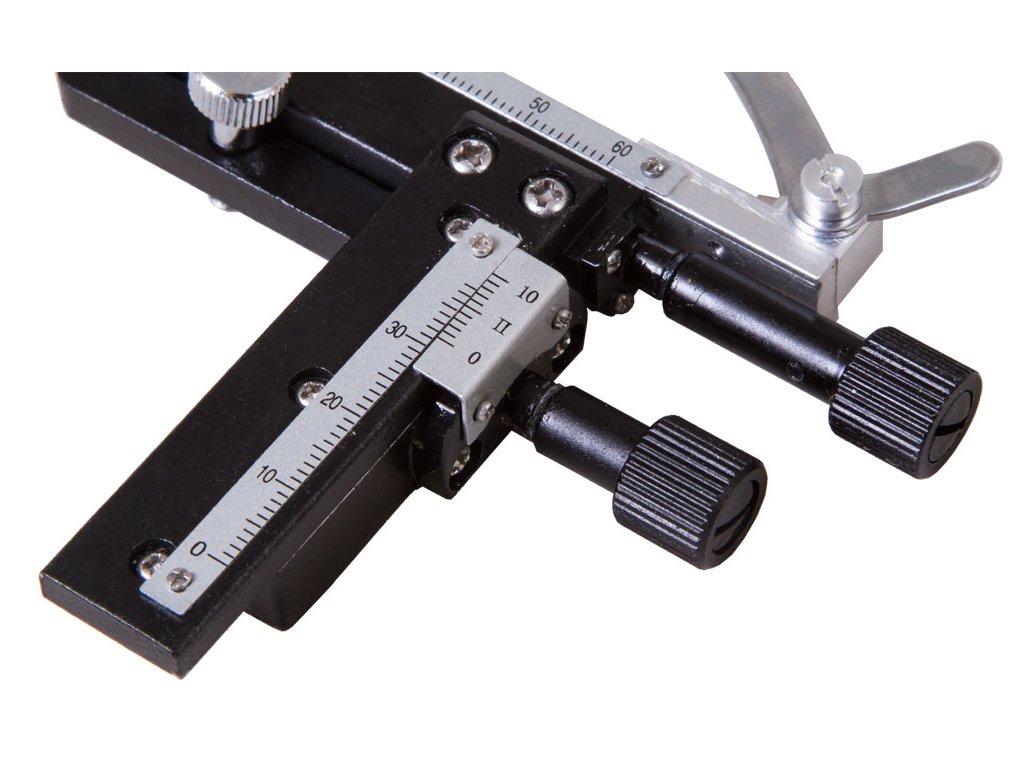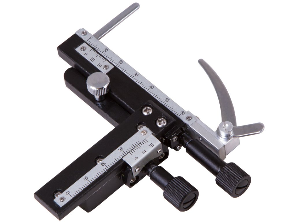 Křížový vodič preparátu Levenhuk MS3 je odnímatelné příslušenství, které je užitečné při podrobném zkoumání mikroskopických preparátů pod biologickým mikroskopem. Instaluje se místo držáků preparátů na stolku a upevňuje se fixačním šroubem.