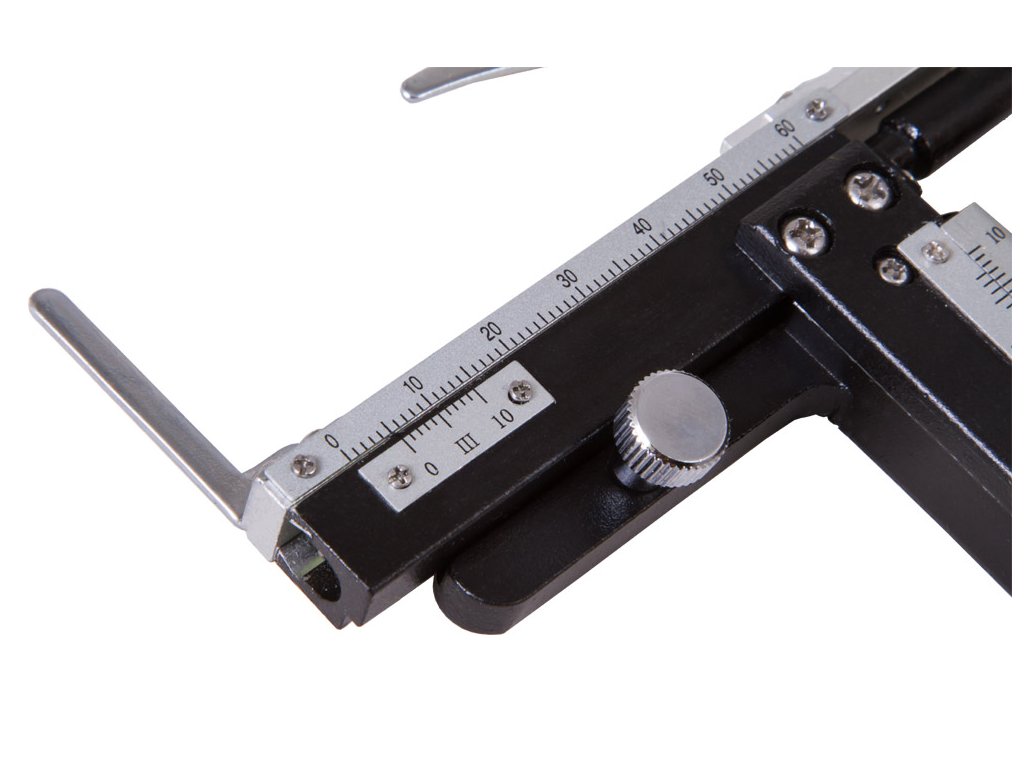 Pomocí křížového vodiče preparátu Levenhuk MS3 můžete mikroskopický preparát posouvat podél osy X (zleva doprava) a osy Y (dopředu a dozadu) a současně určit jeho souřadnice. Toto příslušenství je dodáváno se souřadnicovou a noniovou stupnicí, což je pomocná stupnice ke zpřesnění měření.