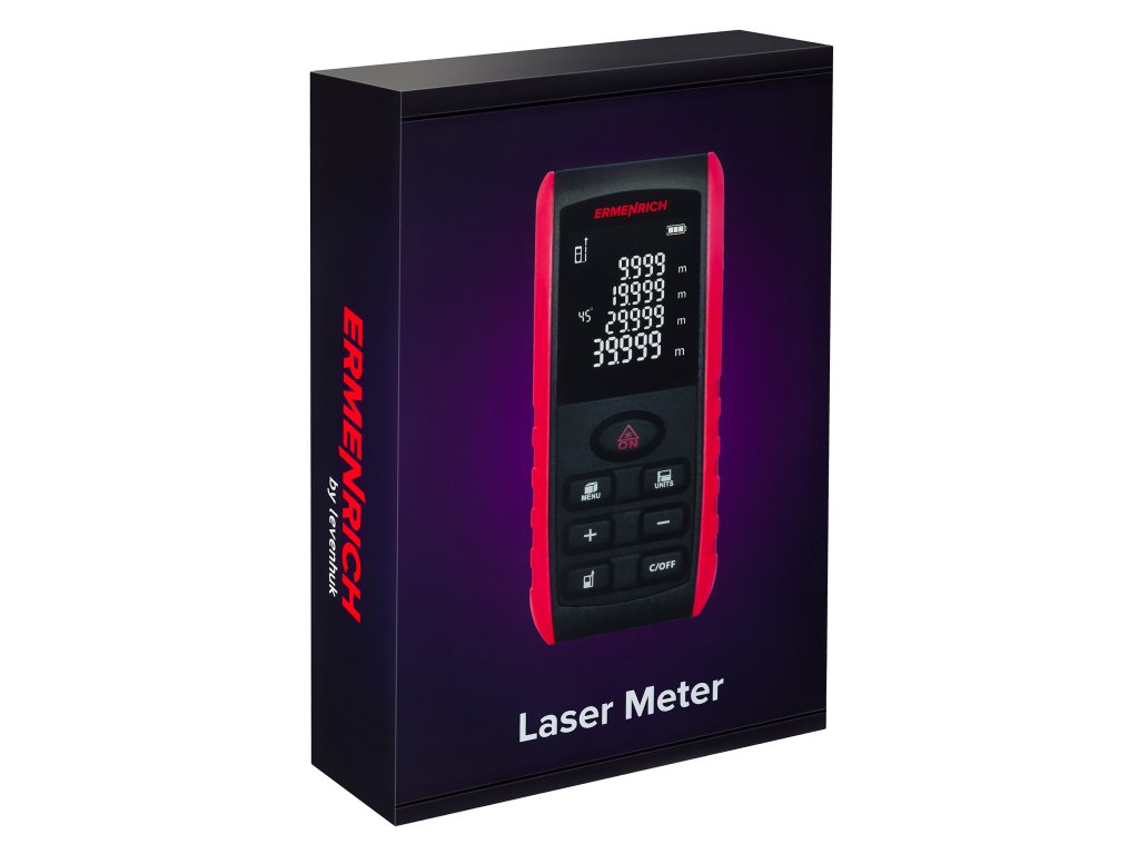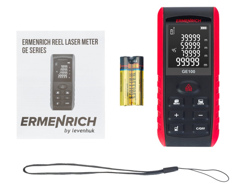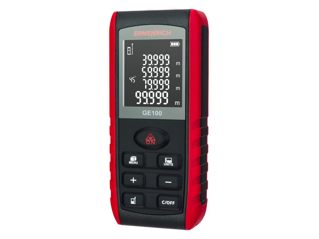 Laserový měřič Ermenrich Reel GE100 je kompaktní přístroj určený pro různé úkoly ve stavebnictví, opravárenství a každodenním životě. Umožňuje určit vzdálenost od bodu k bodu s přesností na 2 milimetry, vypočítat plochu, objem a změřit úhly objektů. Měřič má také funkci Pythagorovy věty – výpočet vzdáleností pomocí mezilehlých měření. To je výhodné v případě, že není možné umístit měřič do požadovaného bodu nebo pokud je v cestě paprsku překážka.