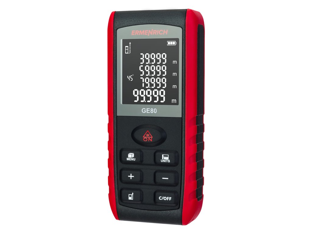Laserový měřič Ermenrich Reel GE80 je univerzální měřicí přístroj, který je užitečný pro mnoho technických, stavebních, opravárenských a domácích prací. Umožňuje měřit nejen vzdálenost, ale také vypočítat objem, plochu a úhly. Funkce Pythagorovy věty byla přidána pro případ, že není možné měřit vzdálenost po přímce (například v dráze laserového paprsku jsou překážky). V tomto případě přístroj provede výpočty na základě průběžných měření.