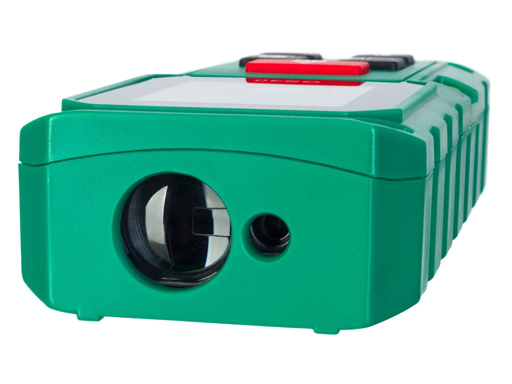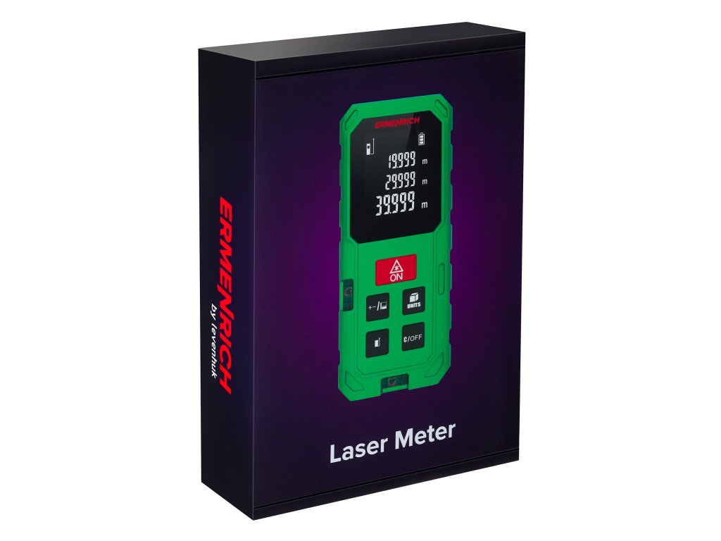 Ermenrich Reel GS100 je moderní laserový měřič pro přesné a pohodlné měření vzdáleností, objemů a ploch. Funkce nepřímého výpočtu pomocí Pythagorovy věty umožňuje vypočítat vzdálenost i v případě, že se v dráze laseru nachází překážka nebo přístroj nelze umístit do požadované polohy. Pomocí dodatečných měření tato funkce vypočítá požadovanou vzdálenost s maximální přesností.