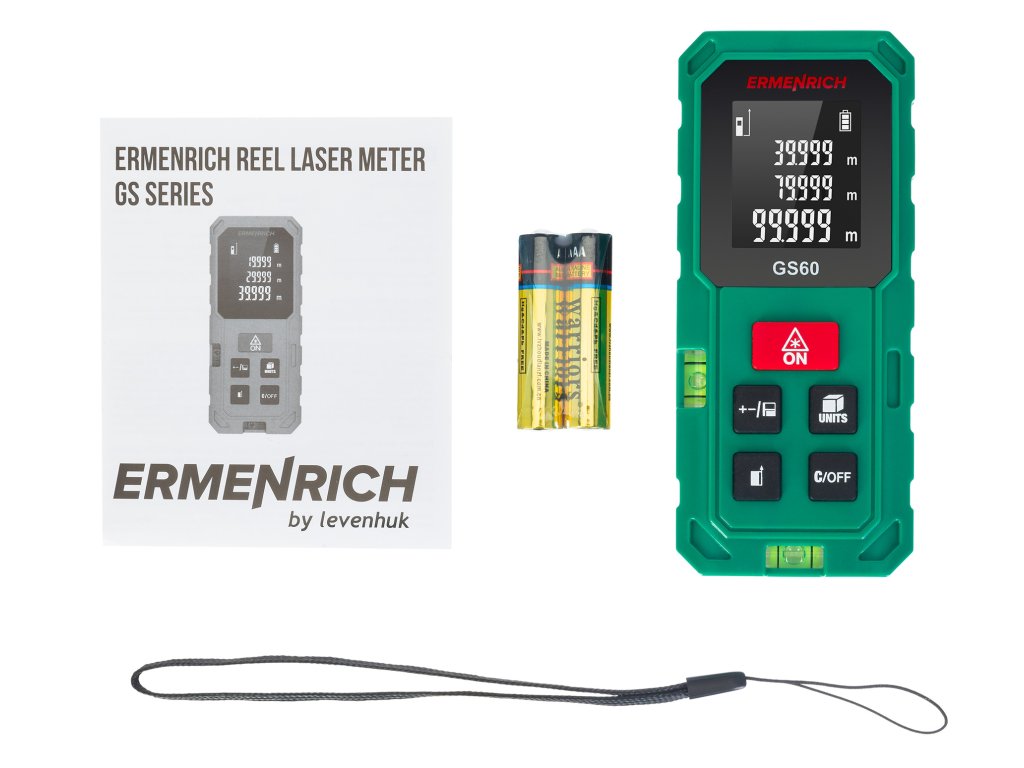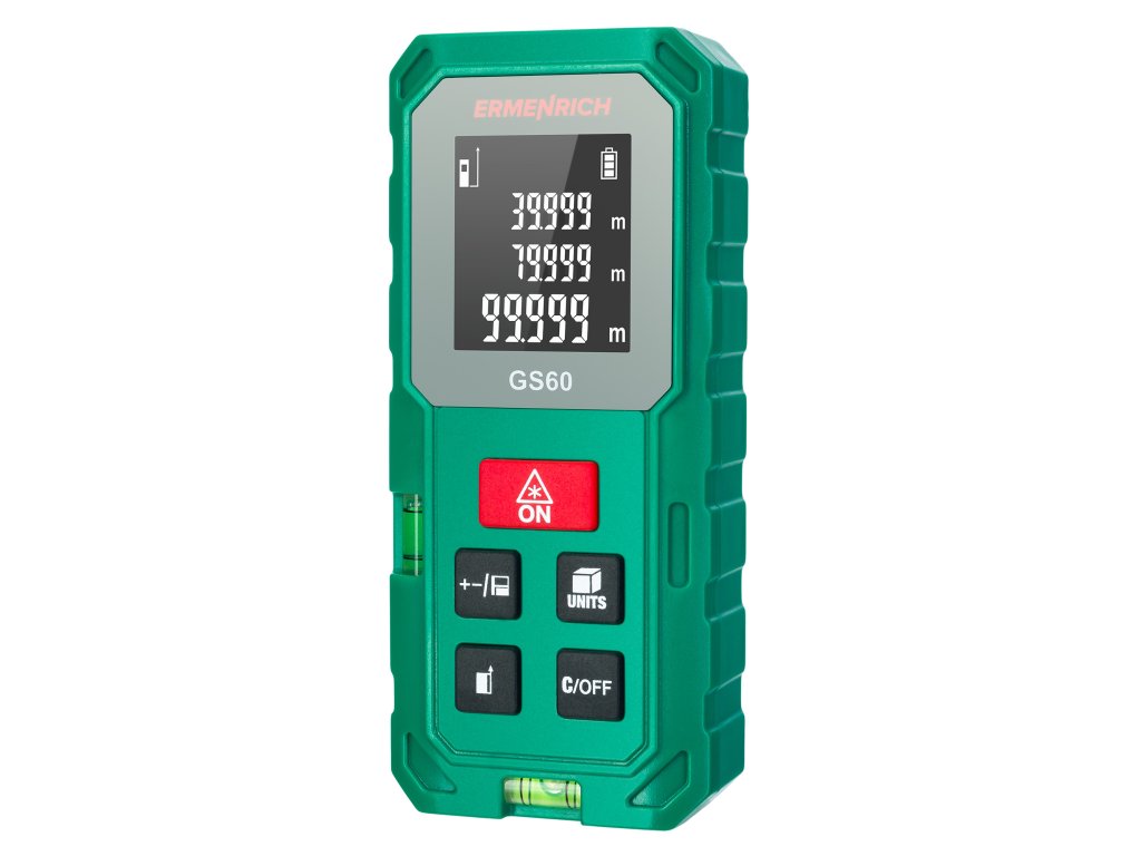 Ermenrich Reel GS60 je moderní laserový měřič pro měření ve stavebnictví, strojírenství, při vyměřování pozemků, při provádění různých oprav a v mnoha dalších oblastech. Umožňuje přesně měřit vzdálenosti a lineární rozměry místností a objektů a vypočítat jejich plochu a objem. Funkce Pythagorovy věty umožňuje vypočítat vzdálenost pomocí mezilehlých měření, pokud není možné přístroj umístit do požadované polohy.