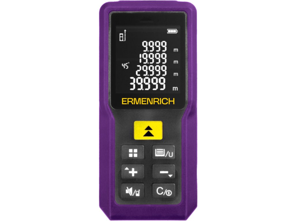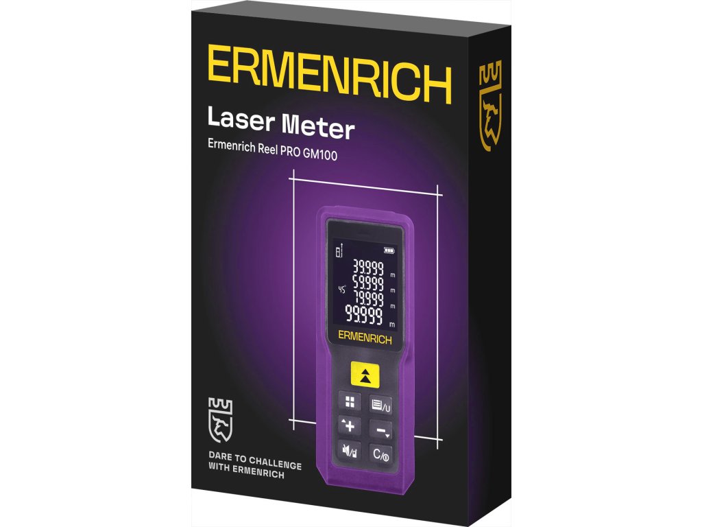 Ermenrich Reel PRO GM100 je laserový měřič určený pro měření na stavbách a při rekonstrukcích. Lze jej také použít pro vytyčování hranic pozemků, geodetických pracích a dalších aplikacích, které vyžadují přesné měření lineárních rozměrů objektu, jeho plochy a objemu. Maximální vzdálenost měření je 100 metrů. Laserový měřič může sloužit také jako laserový úhloměr. Díky funkci Pythagorovy věty automaticky vypočítá vzdálenosti po provedení mezilehlých měření. Tato funkce je užitečná zejména v případě, že nemůžete laserový paprsek zaměřit tak, abyste jej mohli přímo vykreslit z jednoho bodu do druhého.
