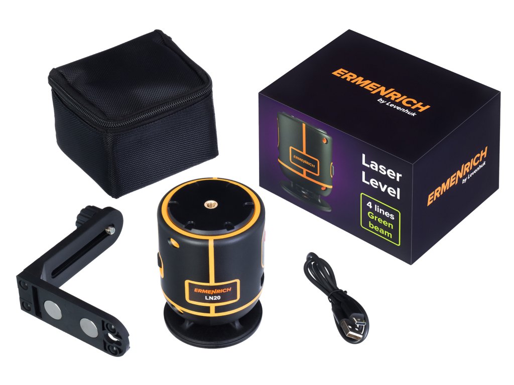 Ermenrich LN20 je přenosný samonivelační laserový přístroj, který generuje čtyři čáry zelené barvy v horizontální rovině. Horizontální rozptyl – plných 360°. Pomůcka je ideální pro použití při stavebních a renovačních pracích, stejně tako i pro instalaci zařízení a osvětlení. Velká pracovní vzdálenost vám umožní pokrýt velký obvod, aniž byste museli zařízení přemisťovat – může dosáhnout i na vzdálenou zeď. Kompenzátor snižuje vibrace a automaticky vyrovnává rovinu laseru.