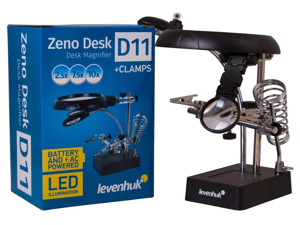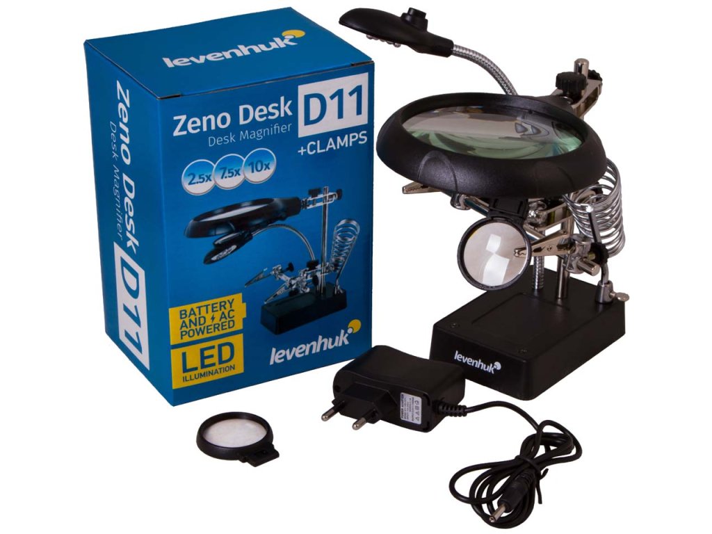 Lupa Levenhuk Zeno Desk D11 je skvělou volbou pro jakýkoli druh vysoce přesné práce. Stane se nepostradatelným nástrojem pro klenotníka, hodináře, modeláře, elektrikáře nebo technika. Tato lupa umožňuje měnit výšku čoček nad pracovní plochou a upevnit předměty pomocí nástroje „třetí ruka“. Kromě toho má vestavěné osvětlení dostatečně výkonné k tomu, aby se s ní dalo pracovat i ve tmě.