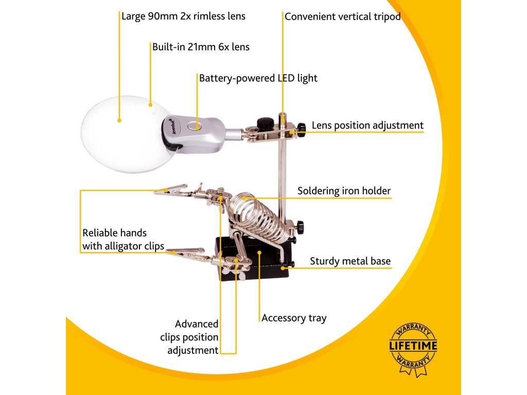 Čočka je vyrobena z optického polymerového skla a díky tomu je obraz zvětšeného předmětu jasný a ostrý. Odolné kovové tělo stojanu je zárukou dlouhé životnosti. Všechny lupy v této řadě mají pomocné držáky k bezpečnému upevnění předmětu.