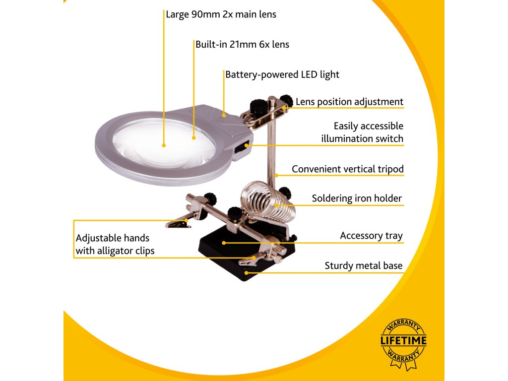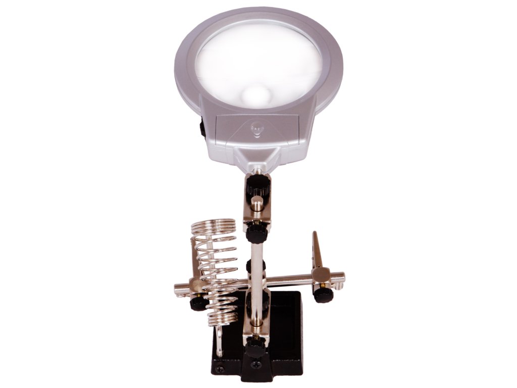 Čočka je vyrobena z optického polymerového skla a díky tomu je obraz zvětšeného předmětu jasný a ostrý. Odolné kovové tělo stojanu je zárukou dlouhé životnosti. Všechny lupy v této řadě mají pomocné držáky k bezpečnému upevnění předmětu.