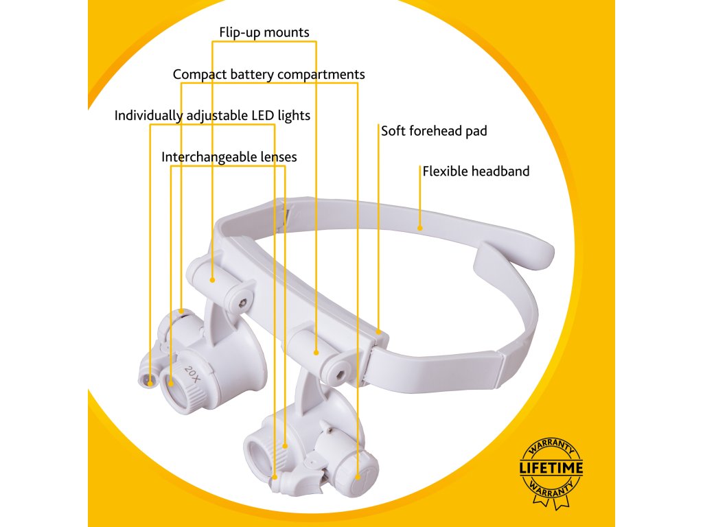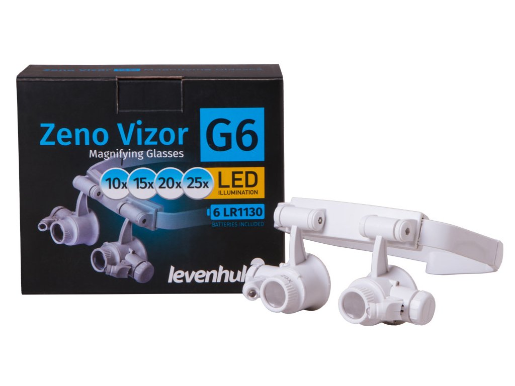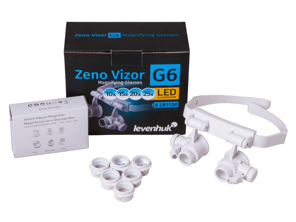 Náhlavní lupy Levenhuk Zeno Vizor jsou skvělými pomocníky pro vaši práci i pro vaše koníčky! Tento model má vyměnitelné čočky s různým zvětšením a LED přisvícení. LED přisvětlení je napájeno z baterií. Pokud ho nepoužíváte, lze jej vypnout. Pokud se nepoužívá, lze jej vypnout. Úhel přisvícení lze regulovat. Náhlavní pásek lze prodloužit a snadno přizpůsobit vaší hlavě. Jeho hlavní výhodou je to, že lupu nemusíte držet a máte proto obě ruce volné pro práci. Lupu máte stále před očima a můžete přes ni sledovat pracovní oblast.
