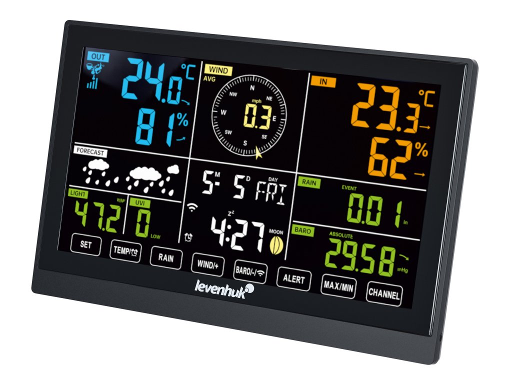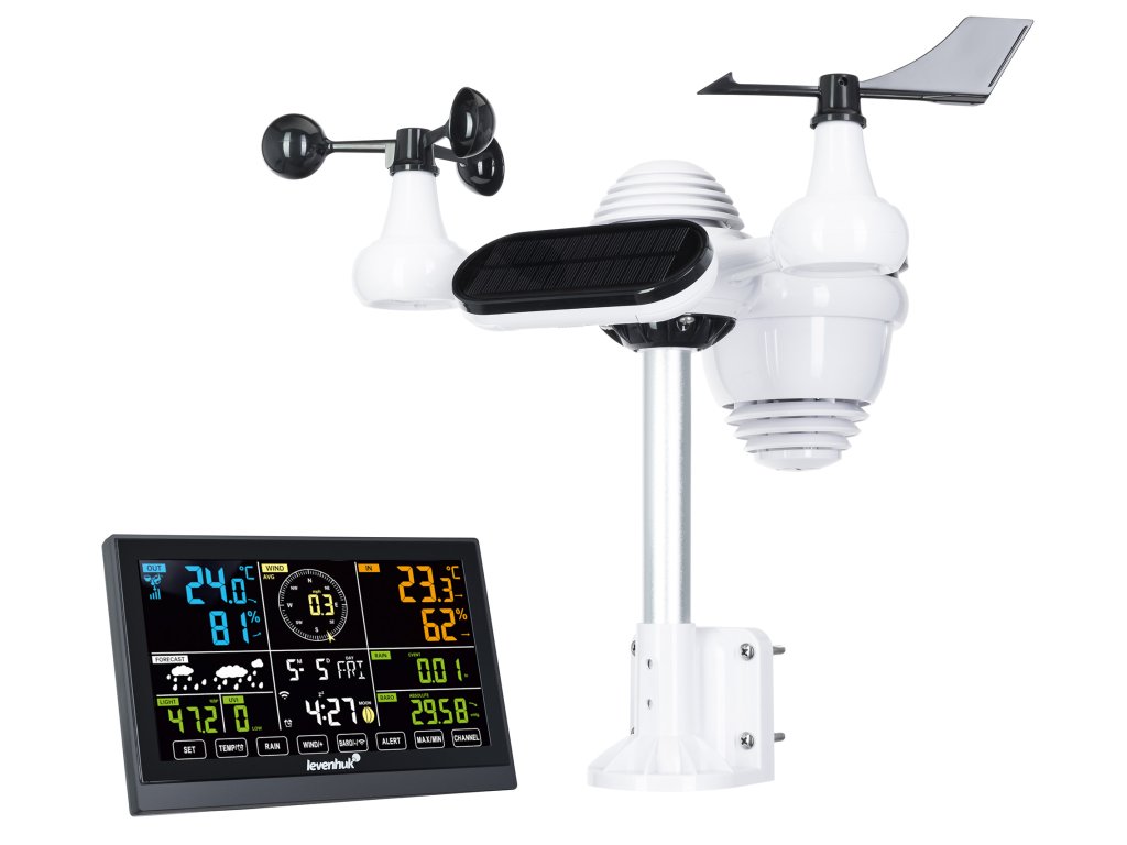 Meteorologická stanice Levenhuk Wezzer PLUS LP140 zahrnuje základní stanici s barevným displejem a dálkový senzor s funkcemi barometru, vlhkoměru, teploměru, anemometru a srážkoměru. Měří současně parametry prostředí v interiéru i exteriéru.