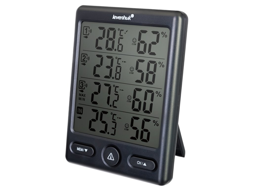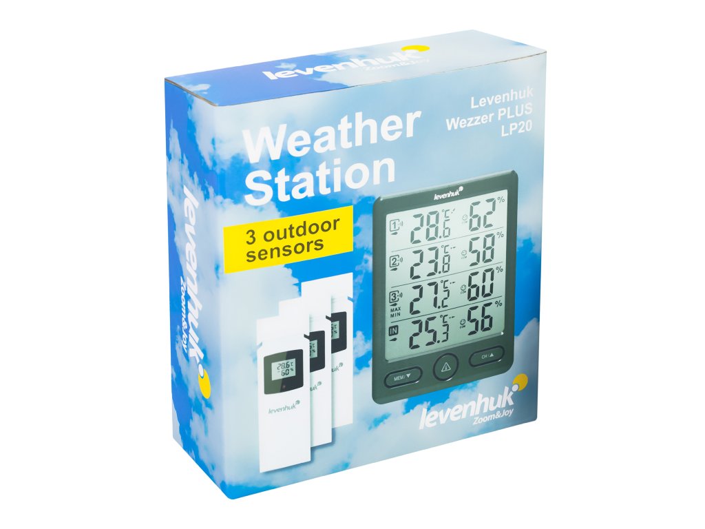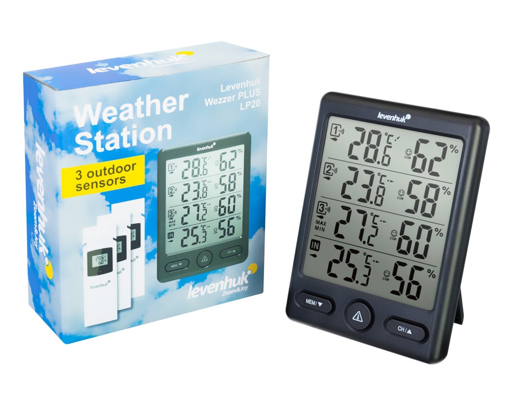 Meteorologická stanice Levenhuk Wezzer PLUS LP20 měří teplotu a vlhkost současně na čtyřech místech. Je to velmi praktický přístroj pro sledování změn počasí a mikroklimatu v několika místnostech, například v budovách na pozemku. Základna meteorologické stanice měří teplotu a vlhkost v místě instalace a lze ji namontovat na stěnu nebo umístit na rovný povrch. Tři bezdrátové senzory dálkového ovládání přenášejí údaje do základnové stanice prostřednictvím rádiového spojení. Senzory mohou být namontovány na stěnách až do vzdálenosti 100 m od základnové stanice.