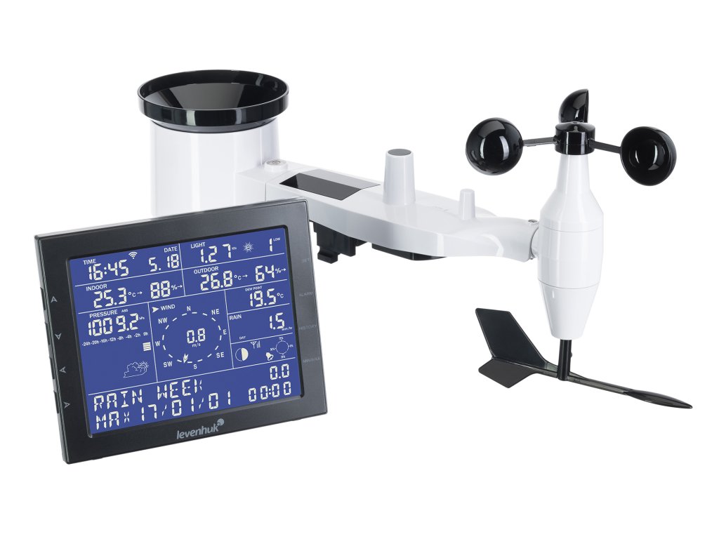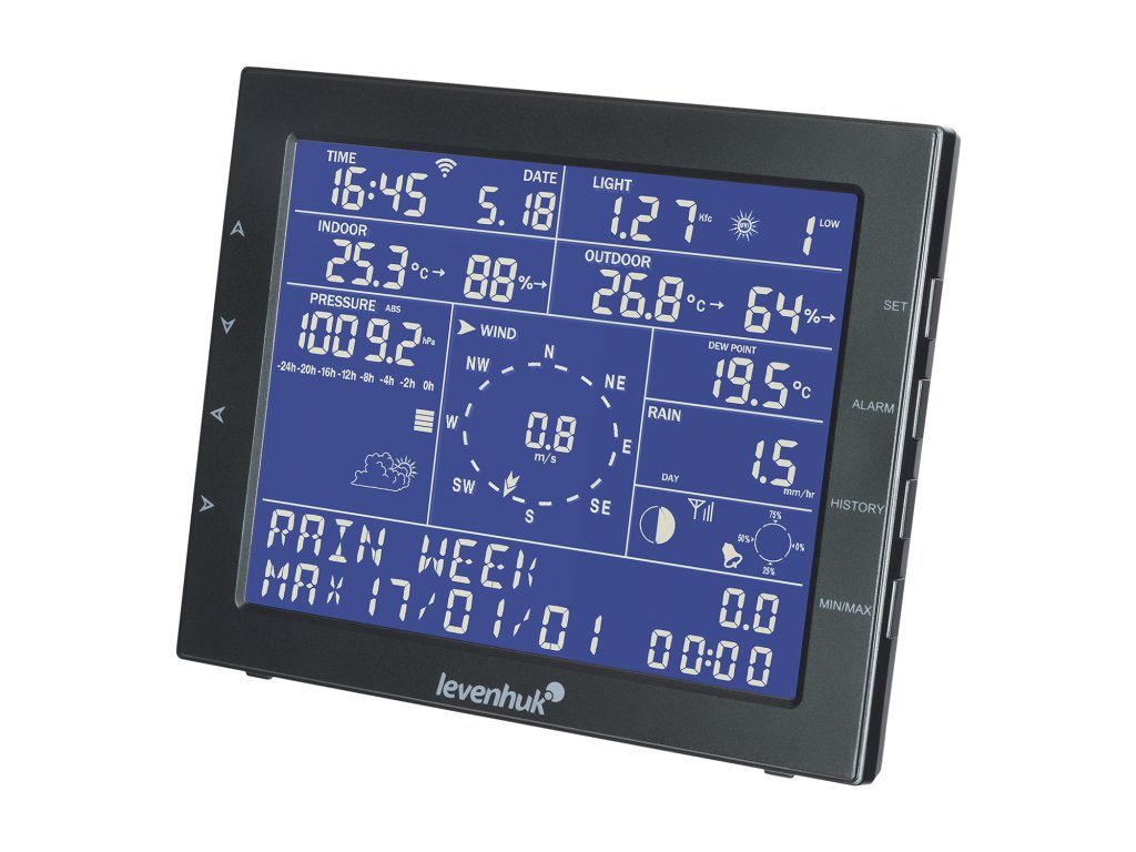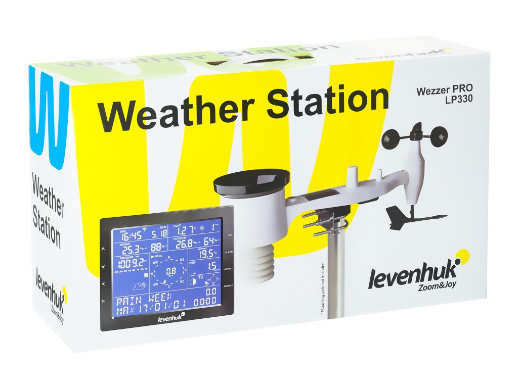 Levenhuk Wezzer PRO LP330 vyniká širokou funkčností profesionálního přístroje a snadným ovládáním, což z něj činí vynikající volbu pro ty, kteří chtějí důkladně sledovat počasí venku a atmosféru v interiéru. Zaznamenává a ukládá teplotu a vlhkost vzduchu venku i uvnitř a informuje svého majitele o atmosférickém tlaku, množství srážek, směru a rychlosti větru, ultrafialovém záření a rosném bodu. Kromě toho může stanice nahradit hodiny, budík a kalendář s fázemi měsíce. Funkce předpovědi počasí bude pro uživatele velmi užitečná.
