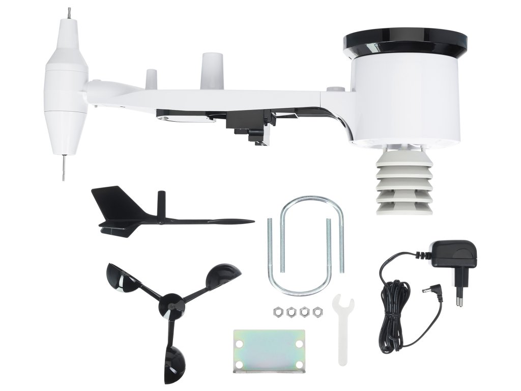 - Měří teplotu, vlhkost vzduchu, tlak, srážky a úroveň osvětlení, UV index, rychlost a směr větru