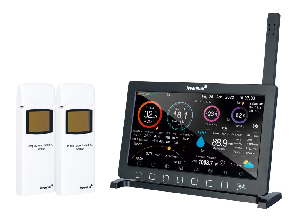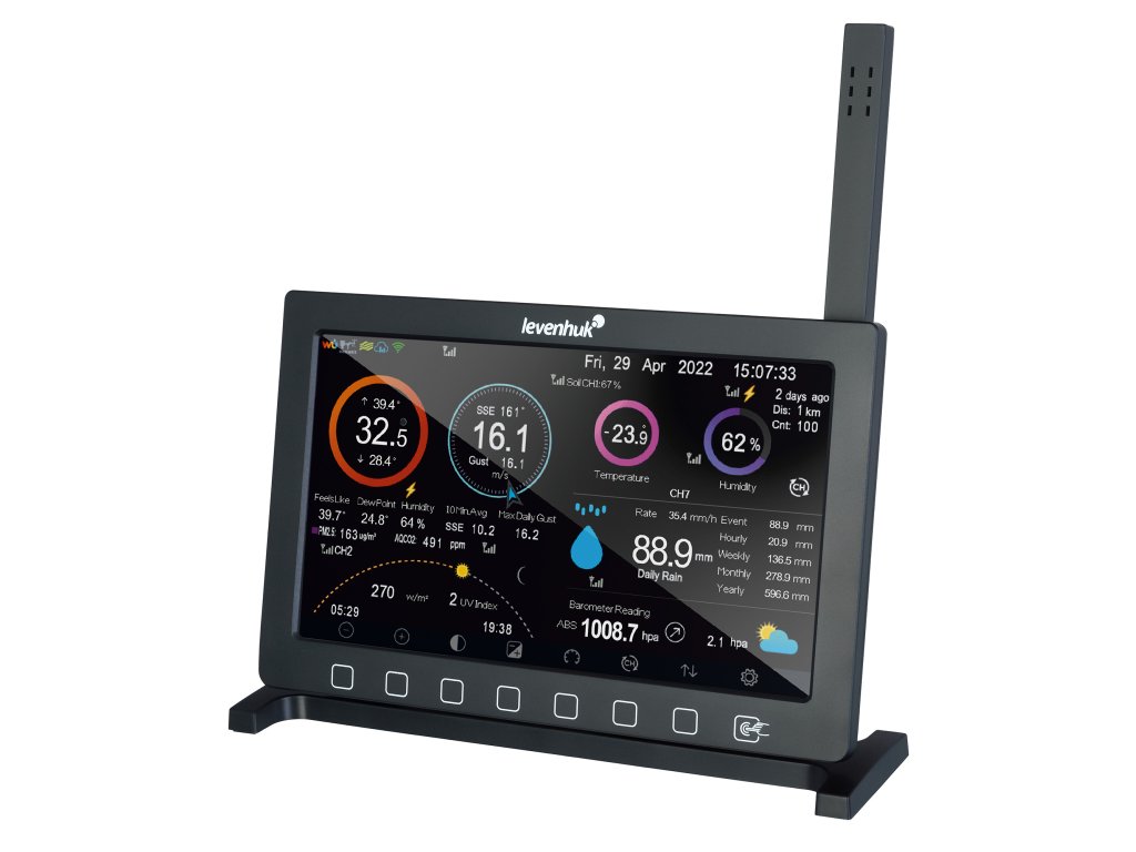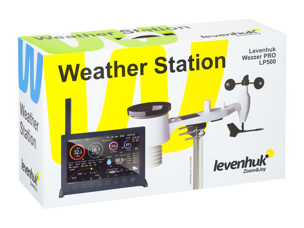 Meteorologická stanice Levenhuk Wezzer PRO LP500 vám poskytne komplexní informace o počasí a pomůže vám také sledovat vnitřní teplotu a vlhkost. Pomocí dálkového rádiového senzoru 9 v 1 meteorologická stanice zaznamenává také atmosférický tlak, rychlost a směr větru, rosný bod, tepelný index, UV index a úroveň osvětlení. Zajímavou vlastností této stanice je, že hlásí nejen naměřenou teplotu, ale také teplotu vnímanou člověkem (parametr „Feels like“). K dispozici je možnost předpovědi počasí. Stanice obsahuje také budík a kalendář s fázemi měsíce. Toto zařízení obsahuje profesionální funkce a zároveň je ideální pro domácí použití díky jednoduchému a pohodlnému ovládání a ergonomickému designu.