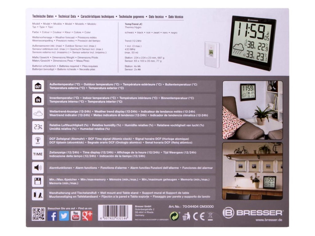 The Bresser TemeoTrend JC LCD Weather Clock has the worldwide first "ultra wide angle" (UWA) display. The large presentation and the broad viewing angle provide for an easy reading of the shown information from almost any position in the room.