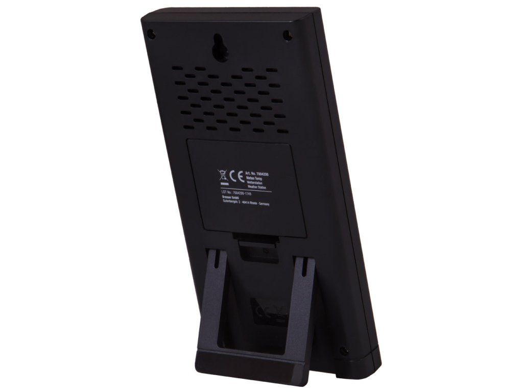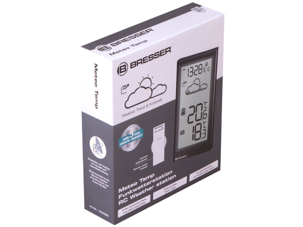 The Bresser Meteo Temp weather station convinces with a clearly arranged display, on which you can always read the current time and date because of the DCF radio signal. Furthermore, the weather station offers information about the temperature inside and outside. The outdoor values are supplied by the outdoor sensor that is included in the kit. A graphical weather trend display shows you the weather trend for the coming hours. The rectilinear design adapts to any interior decoration and does not require visible switches.