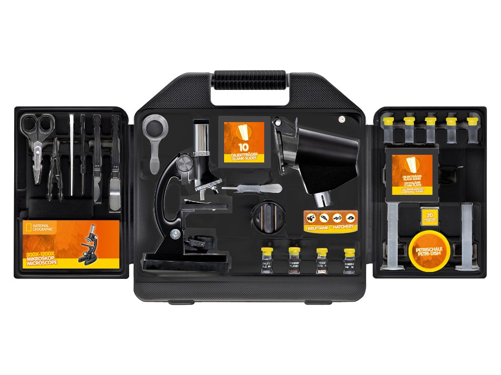 A quick entry into the world of microscopy is provided by the National Geographic 300-1200x microscope including hard case.