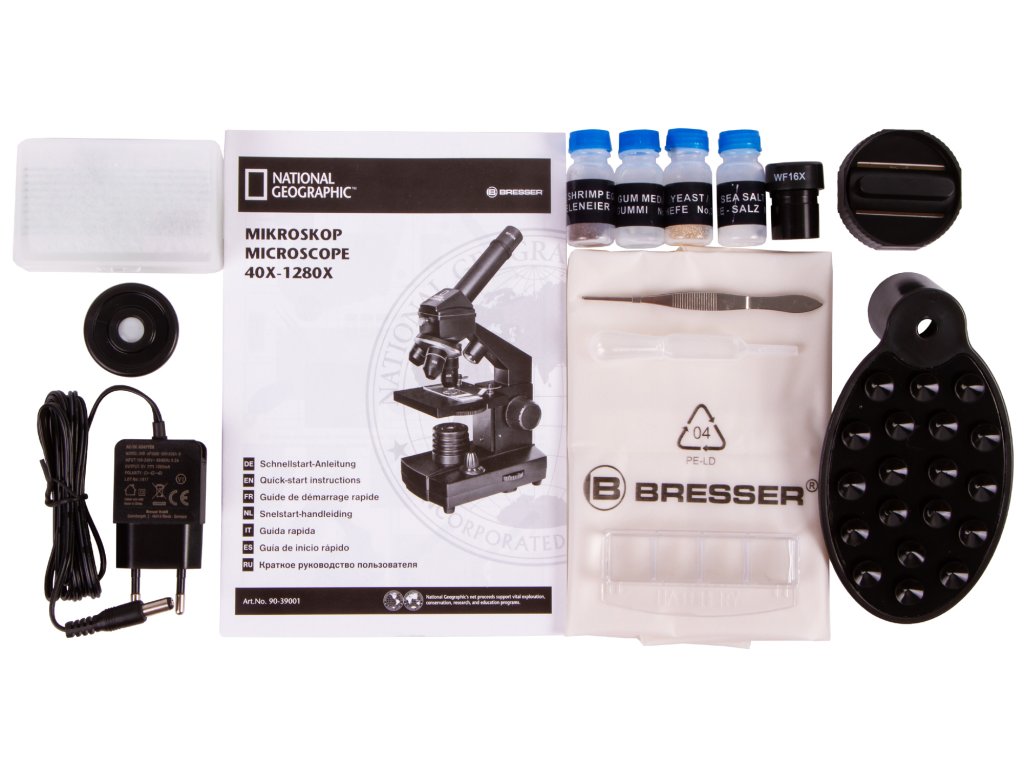 Mikroskop Bresser National Geographic 40–1280x se dodává s bohatou sadou příslušenství: dva okuláry, Barlowova čočka, připravená podložní a krycí sklíčka, inkubátor, pinzeta, kapátko a držák chytrého telefonu. V sadě najdete také prázdná podložní a krycí sklíčka pro přípravu vlastních vzorků. V uživatelské příručce najdete podrobný popis vybraných pokusů. Souprava obsahuje vše, co začínající mikrobiolog potřebuje, aby mohl ihned začít provádět pokusy.