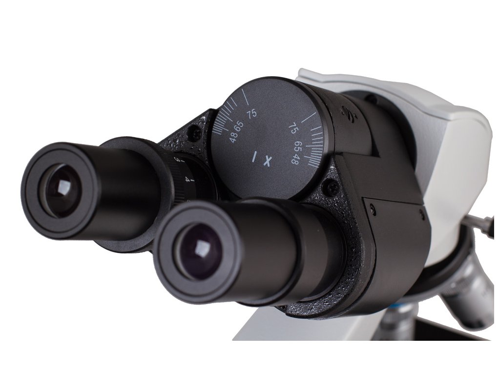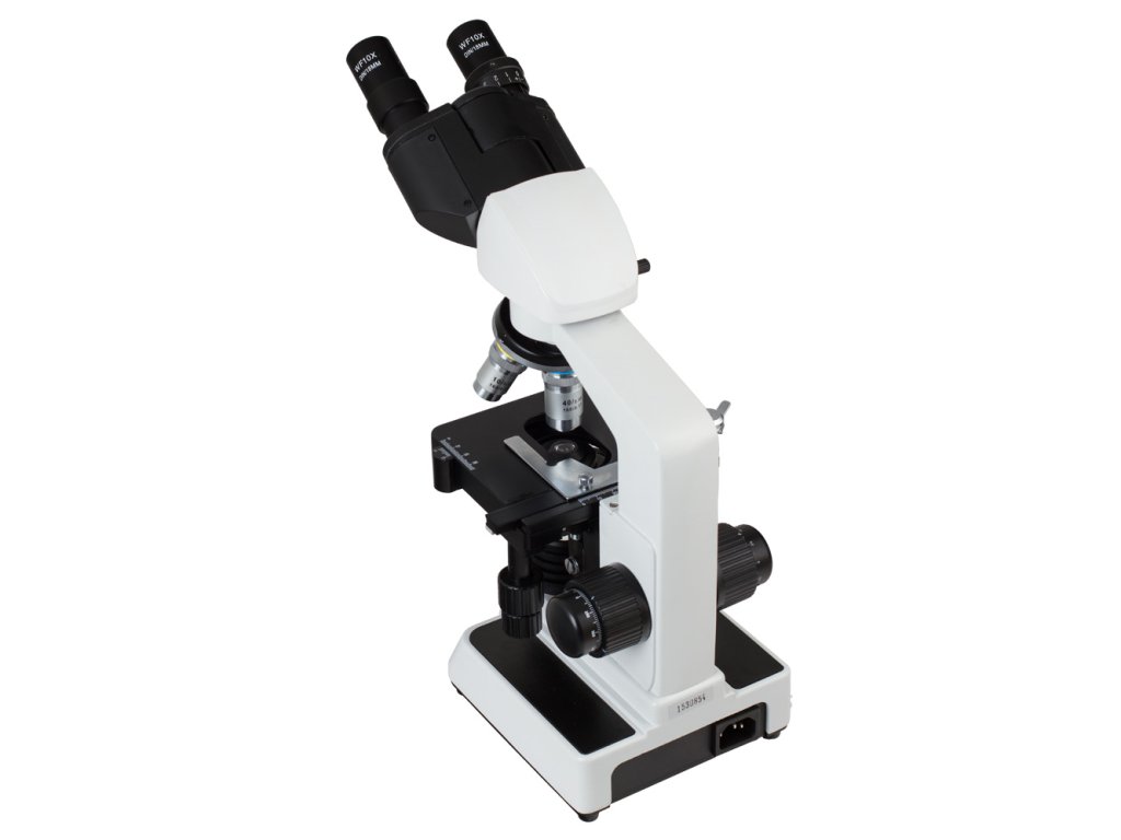 Mikroskop je vybaven pracovním stolkem s posuvným měřítkem, který umožňuje upevnění dvou preparátů najednou, a šrouby hrubého a jemného nastavení zajišťují nejpřesnější možné umístění objektu pod objektivem. Revolverový nosič se čtyřmi objektivy umožňuje získat zvětšení od 40x do 1000x. Díky čočce o zvětšení 100x lze použít olejovou imerzní techniku. Výkonné LED osvětlení vám umožňuje pozorovat preparáty v procházejícím světle. Plynulé nastavení jasu umožňuje Abbeův kondenzor s irisovou clonou. Součástí sady je i modrý filtr.