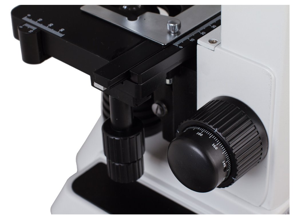 - Koaxiální šrouby jemného zaostření umístěné na obou stranách mikroskopu
