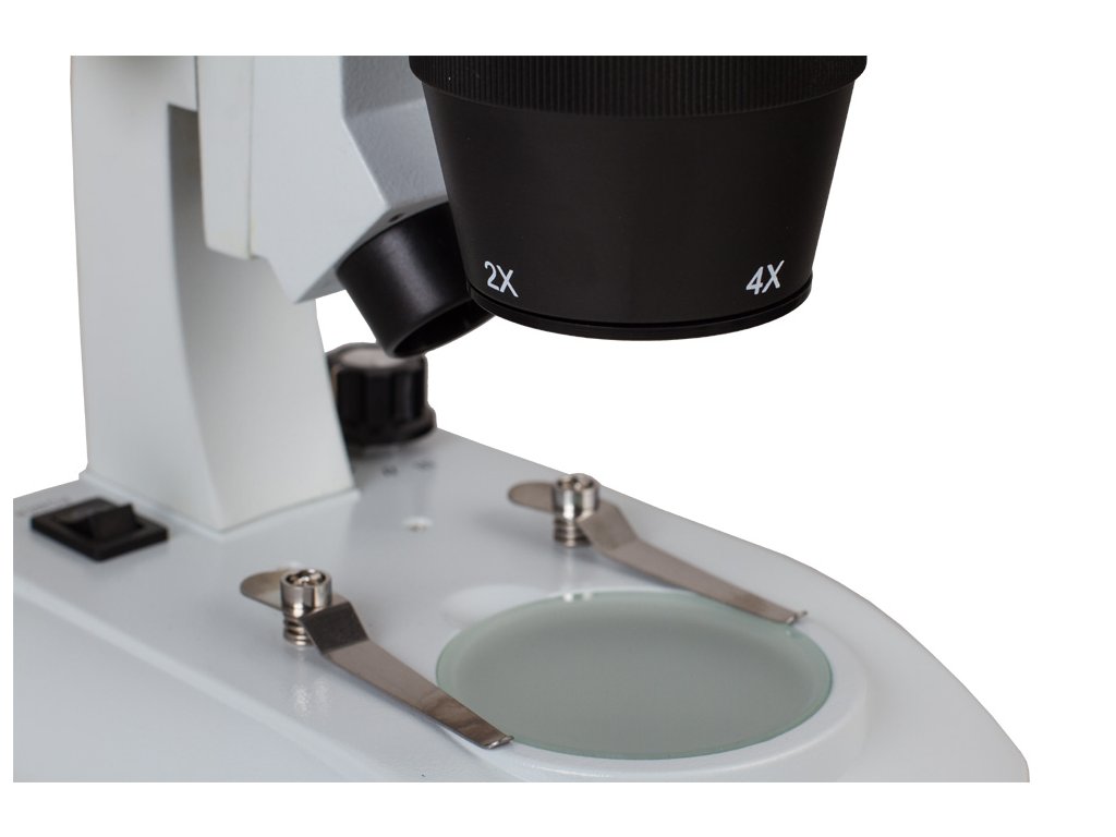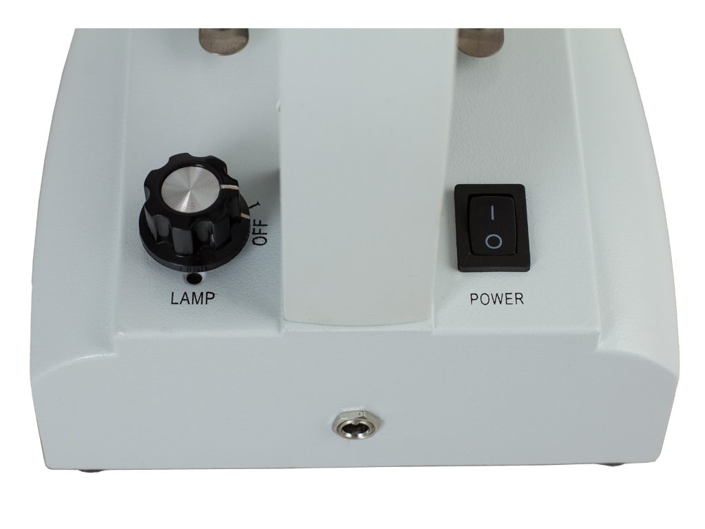 Pracovní stolek mikroskopu je vybaven dvěma svorkami. Horní a spodní LED osvětlení lze používat společně nebo samostatně, a to v závislosti na konkrétním pozorovaném objektu. Jas osvětlení lze také regulovat.