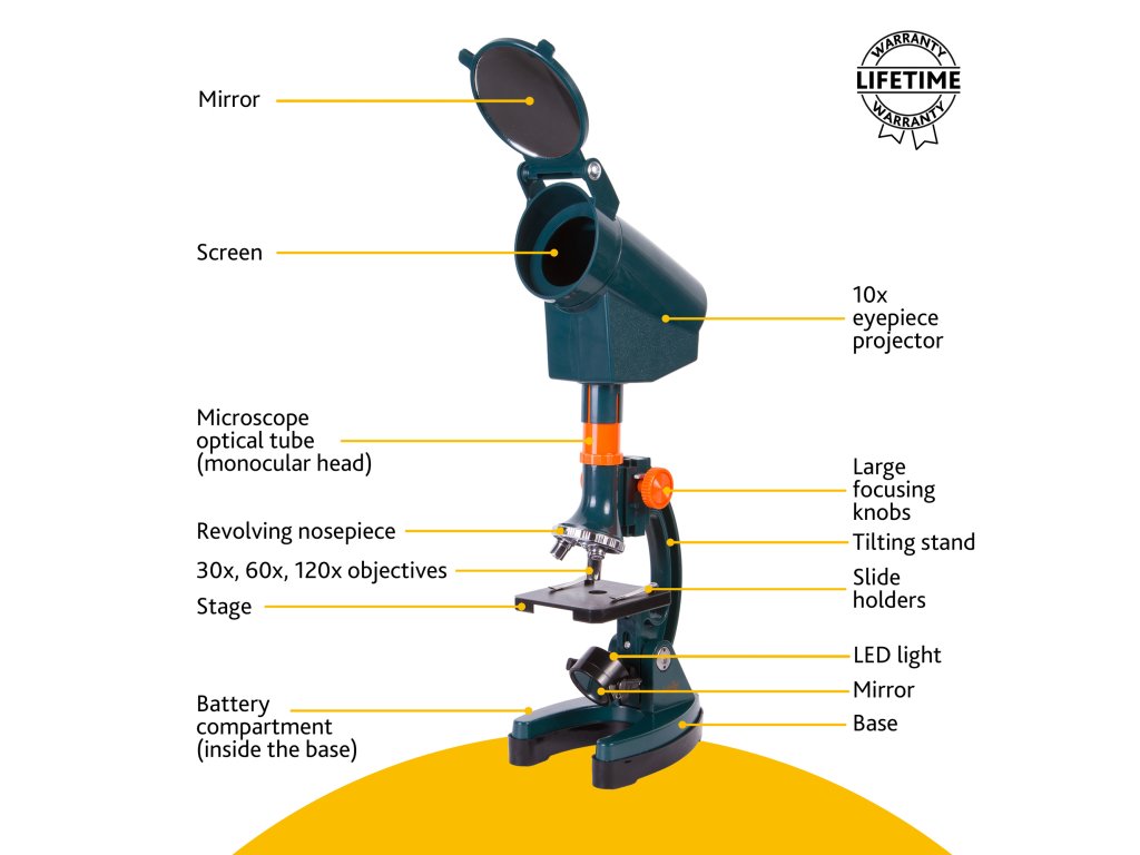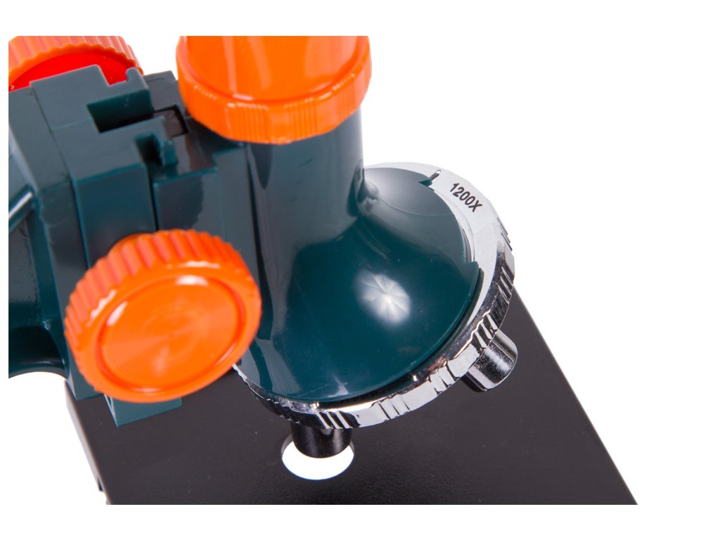 Mikroskop nabízí několik pevných hodnot zvětšení v rozsahu 300x až 1200x. Lze je snadno měnit bez přerušení pozorování – vše, co musíte udělat, je pootočit revolverový nosič objektivů na mikroskopu. Osvětlení je umístěno pod stolkem – to znamená, že můžete sledovat libovolné průhledné mikroskopické preparáty. Osvětlení je napájeno z baterií (nejsou součástí balení). Pokud je externí osvětlení dostatečné, můžete k osvětlení preparátu použít vestavěné zrcátko.