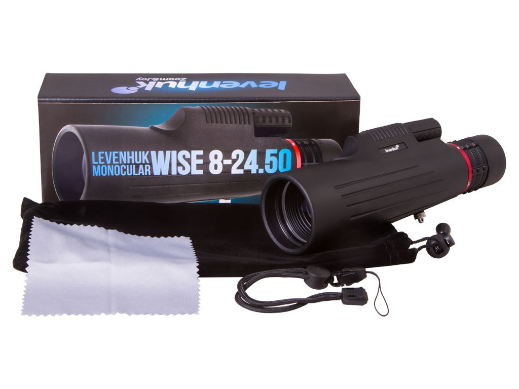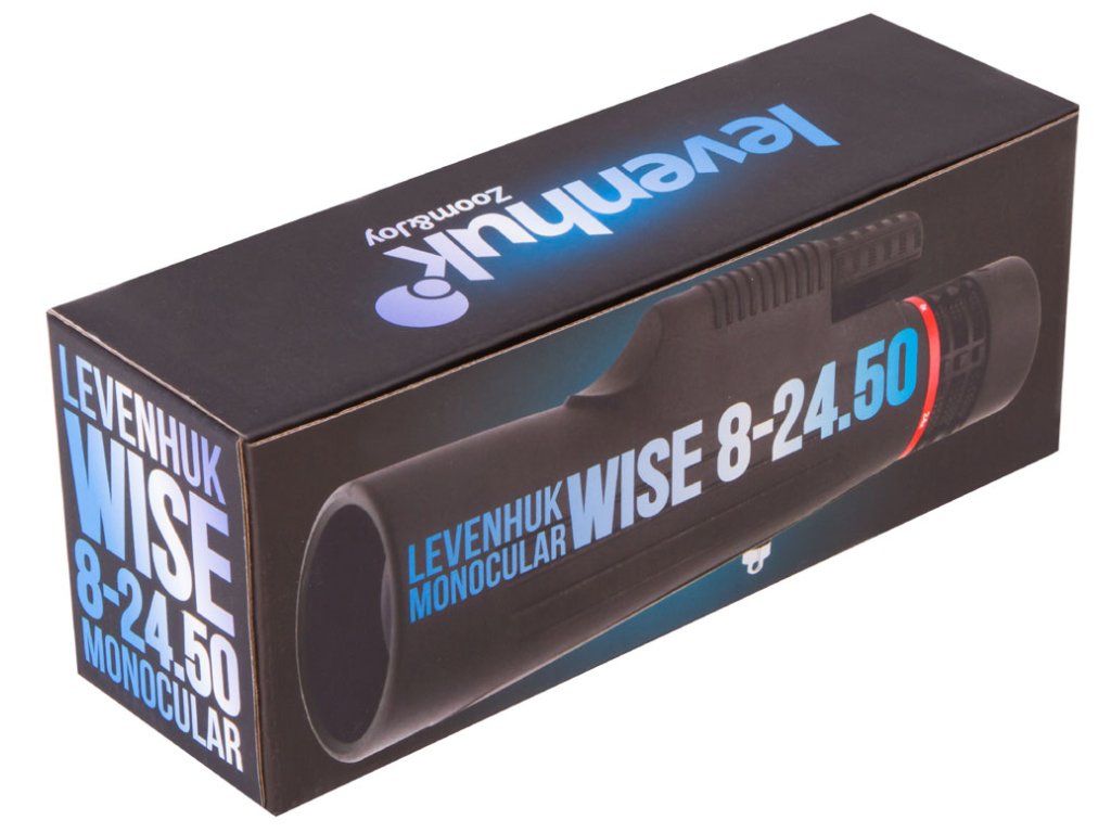 Levenhuk Wise 8–24x50 je monokulární dalekohled s vysokou světelností s proměnným zvětšením v rozsahu od 8x do 24x. Tento výkonný a spolehlivý optický přístroj doporučujeme zakoupit všem cestovatelům, turistům a pozorovatelům přírody a zvěře v ní žijící. Dokážete s ním též podrobně sledovat architektonické prvky v historických centrech měst. Proměnné zvětšení přispívá k univerzálnosti použití tohoto optického přístroje – velké objekty lze snadno pozorovat a zaostřovat na sledované objekty při nízkém zvětšení. Navíc dokážete podrobně sledovat malý cíl při maximálním zvětšení.