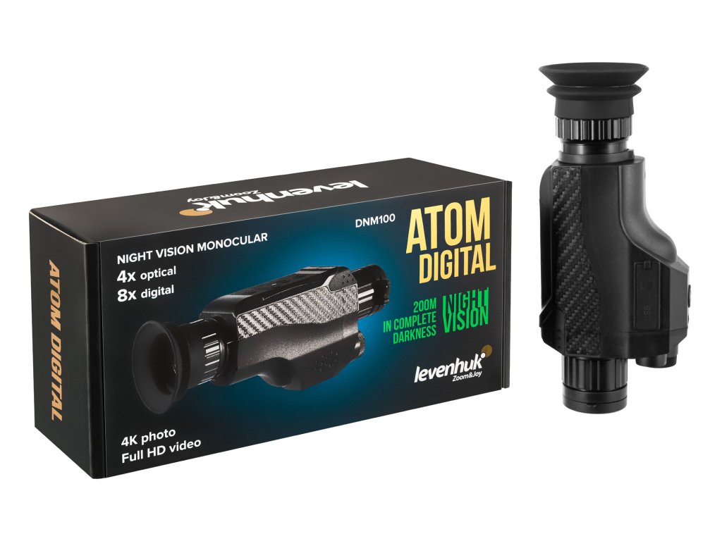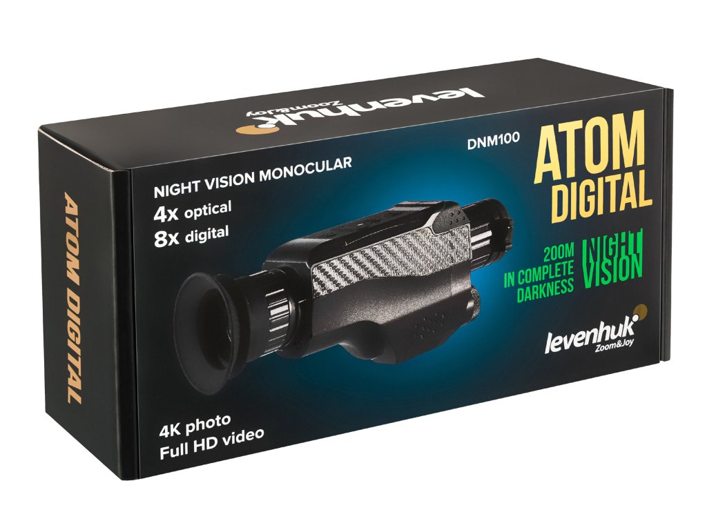 Monokulární dalekohled s nočním viděním Levenhuk Atom Digital DNM100 je spolehlivý přístroj pro pozorování vzdálených objektů v kteroukoliv denní dobu. Bez ohledu na světelné podmínky vytváří přístroj vysoce kvalitní obraz se 4x zvětšením, které lze navíc zvětšit pomocí digitálního zoomu (1–8x). Tento monokulární dalekohled se skvěle hodí pro lov, orientační běh, kempování a hlídkování.