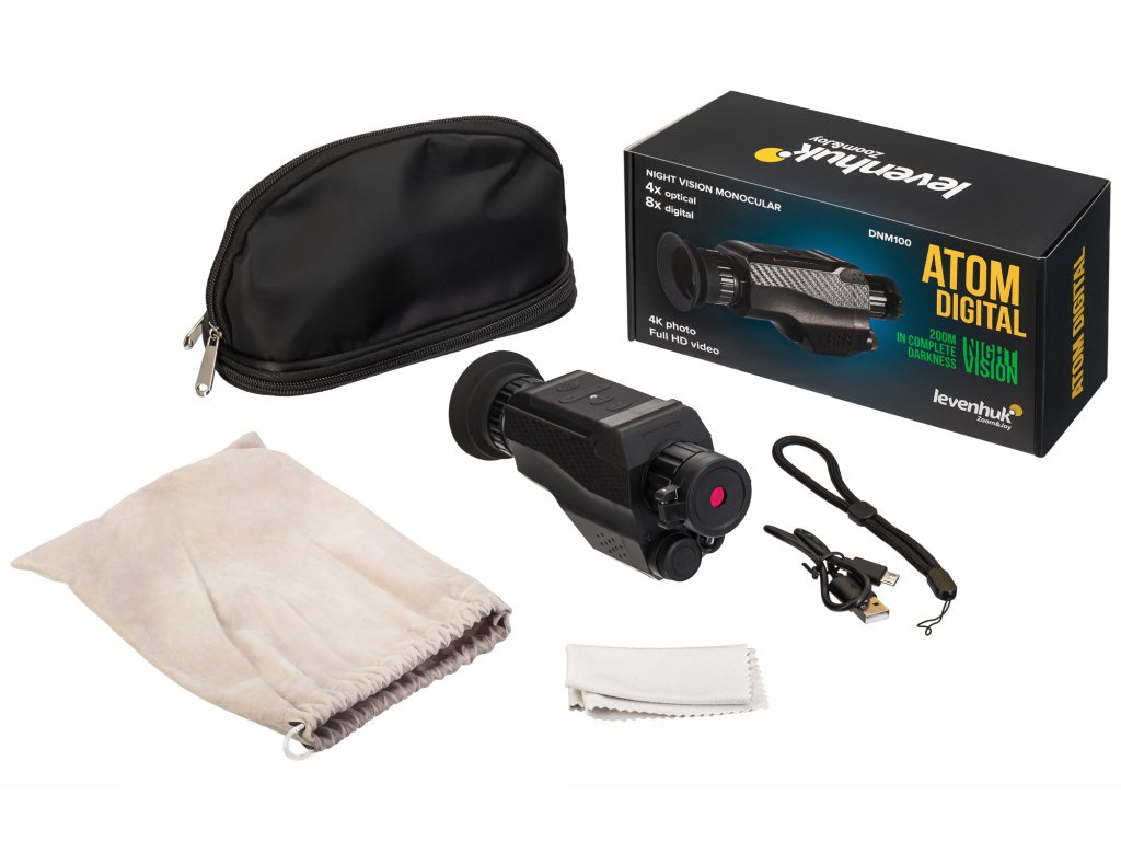 Během dne je pozorovací vzdálenost monokulárního dalekohledu Levenhuk Atom Digital DNM100 neomezena a v noci můžete zkoumat okolí do vzdálenosti 200 m. Pro stacionární pozorování nebo fotografování lze přístroj upevnit na stativ pomocí 1/4" držáku. Vestavěný rekordér umožňuje ukládat záznamy ve formátu fotografie a videa na paměťovou kartu s vysokou kapacitou (až 128 GB). Port USB je umístěn vedle slotu pro kartu. Maximální rozlišení fotografií může dosahovat 4096x2160 pixelů a videa jsou zaznamenávána v rozlišení Full HD.