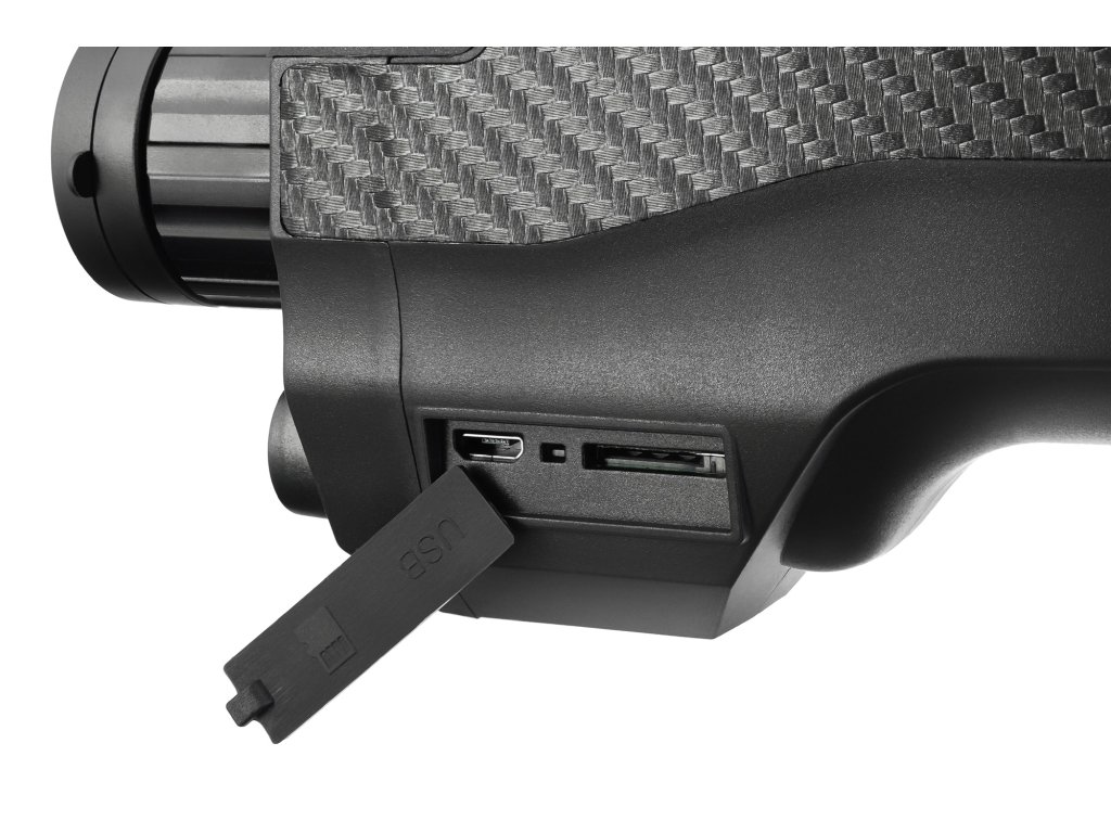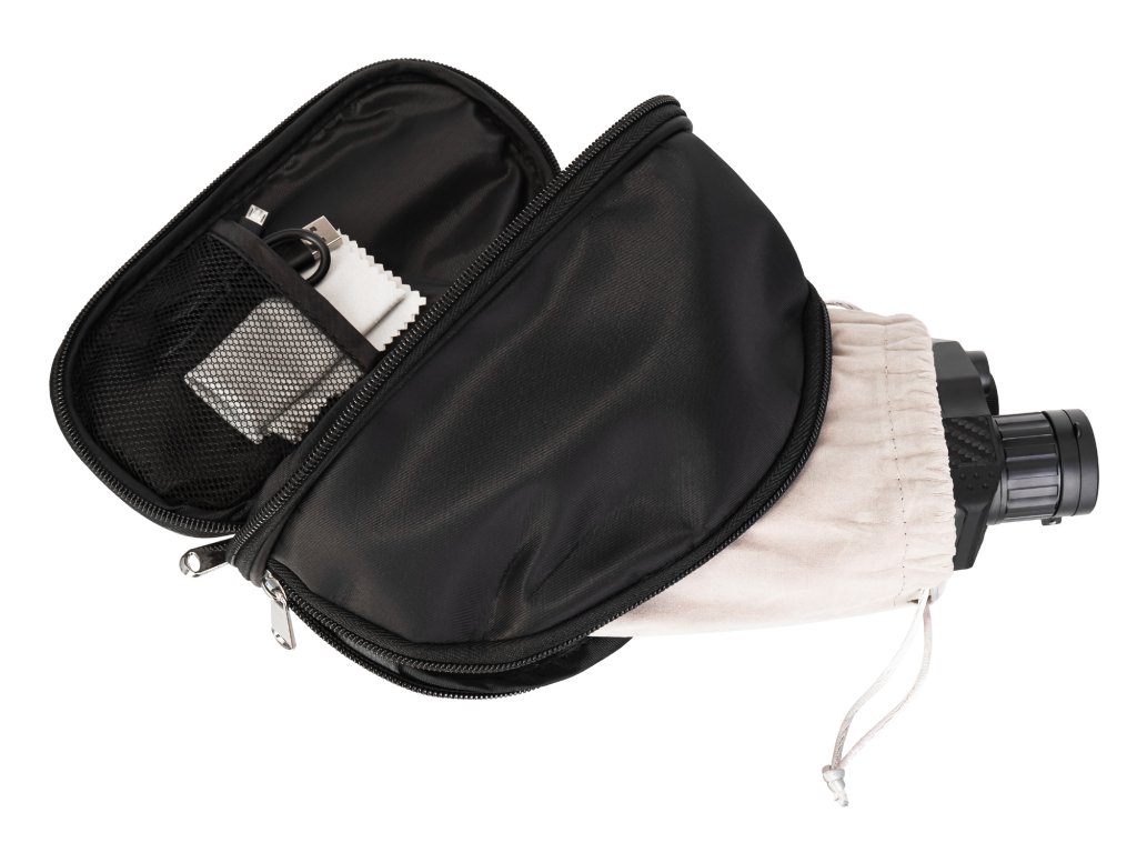 Lehké tělo monokulárního dalekohledu je vyrobeno z ABS plastu – materiálu, který je známý svou odolností vůči mechanickému namáhání. Přístroj se pohodlně drží v rukou a při přepravě nezabírá mnoho místa. Monokulární dalekohled je napájen vyměnitelnou dobíjecí baterií a doba provozu na jedno nabití trvá až 5 hodin (při vypnutém infračerveném osvětlení). Funkce automatického vypnutí displeje a přístroje vám výrazně pomůže šetřit energii baterie.