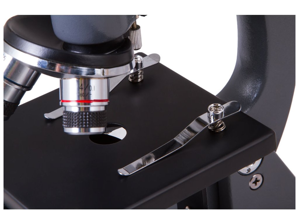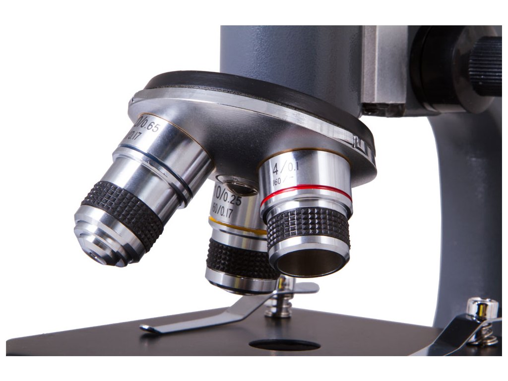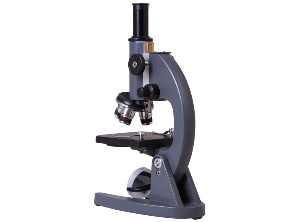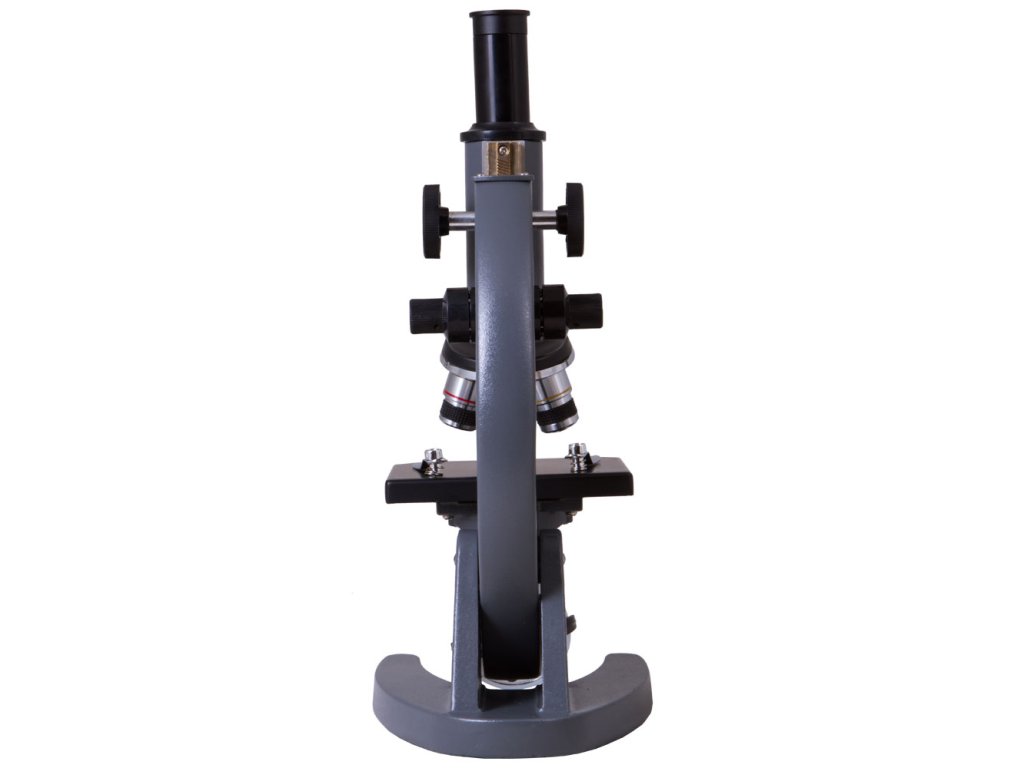 Veškeré optické členy mikroskopu jsou vyrobeny ze skla a jsou chráněny odolným kovovým tělem. Revolverový nosič je určen pro tři objektivy a snadno se otáčí. Monokulární okulárový tubus umožňuje měnit okuláry tak, aby bylo dosaženo odpovídajícího zvětšení. Pracovní stolek je vybaven standardními upínacími svorkami. Ostrost obrazu lze nastavit makrošroubem a mikrošroubem.