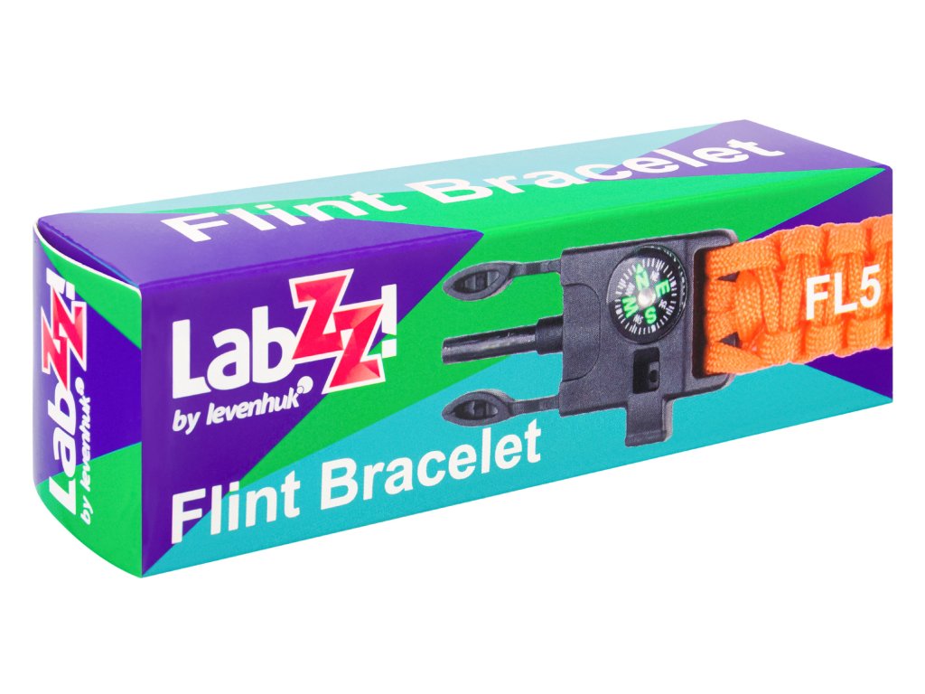 Hlavními prvky náramku pro přežití Levenhuk LabZZ FL5 jsou křesadlo a kousek oceli k rozdělání ohně zabudované do spony. Tento kousek oceli má ostrý břit a slouží jako miniaturní nůž. Náramek obsahuje píšťalku pro vysílání signálů, tekutý kompas s ciferníkem pro orientaci na světové strany a korekci trasy během túry. Pokud náramek rozmotáte, budete mít k dispozici 2 metry dlouhou silnou nylonovou šňůru.
