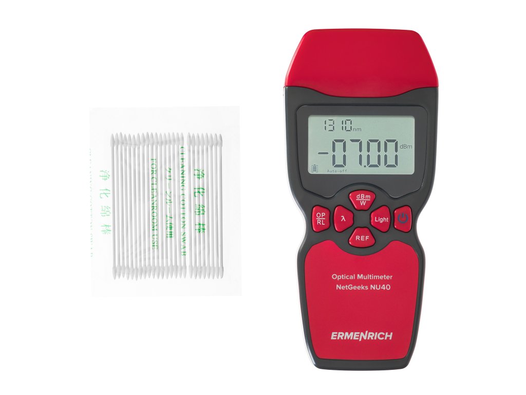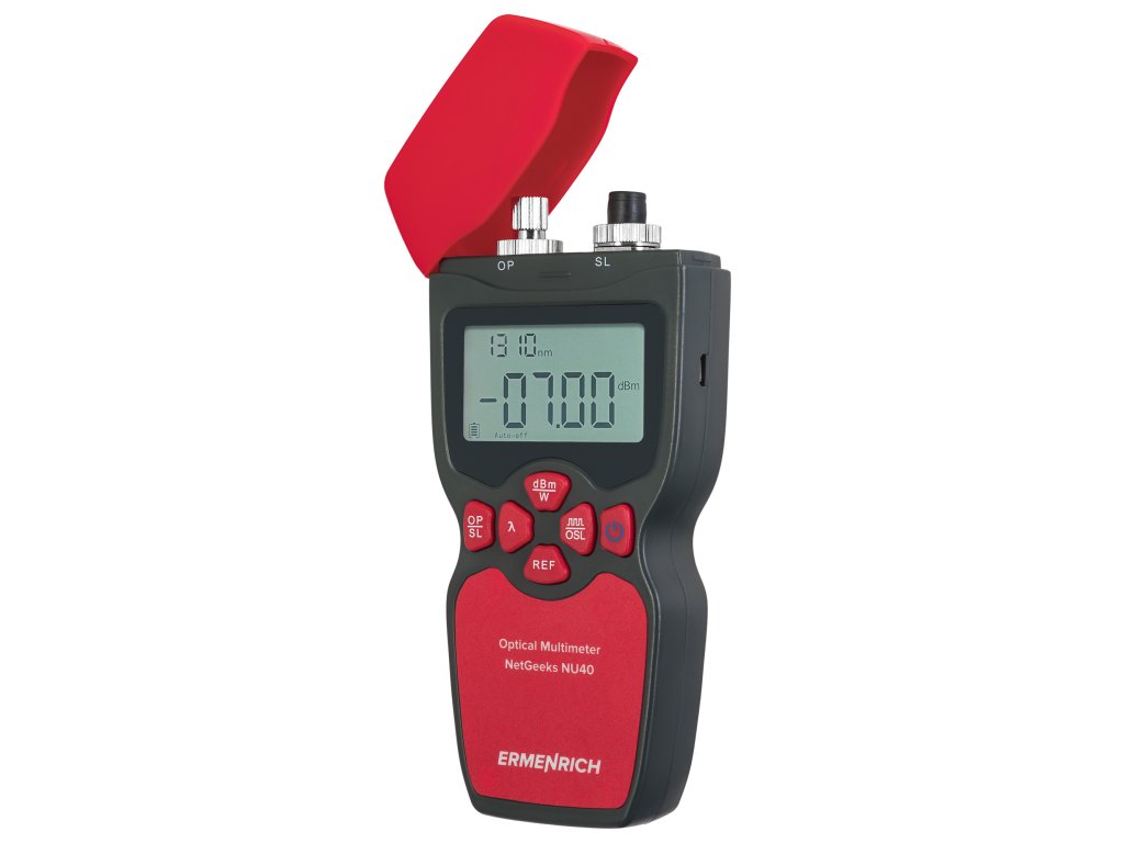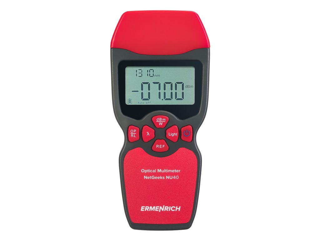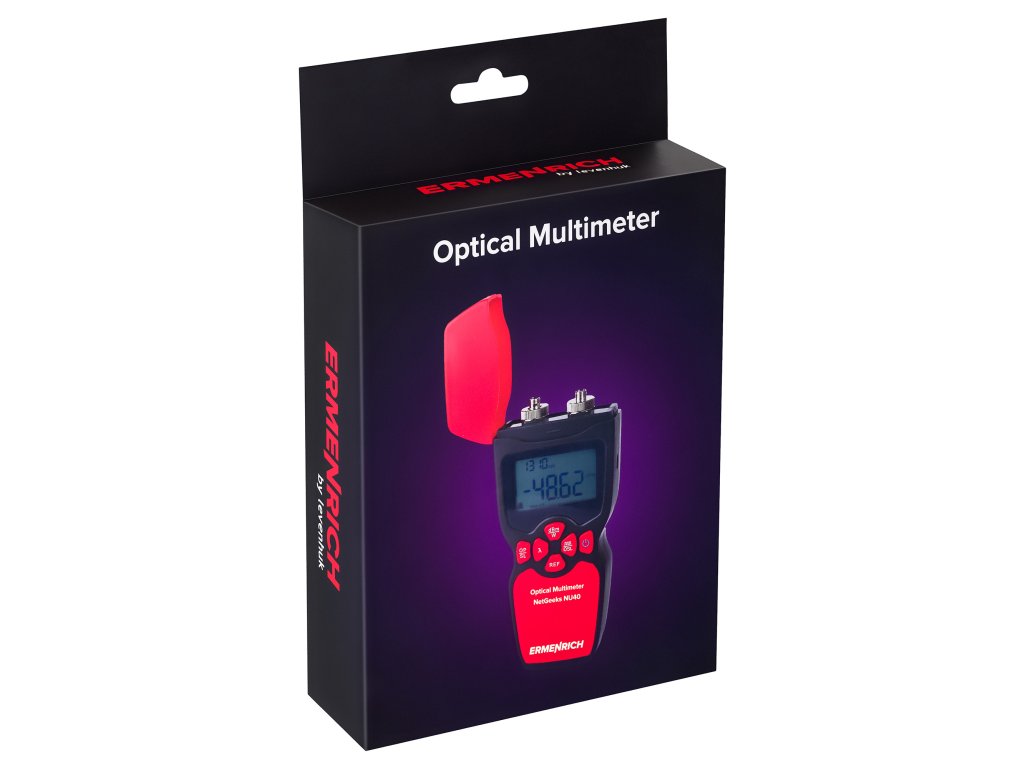 Optický multimetr neboli měřič optického výkonu Ermenrich NetGeeks NU40 – nezbytný nástroj pro profesionály, kteří instalují a udržují optické komunikační linky (FOCL). Přístroj umožňuje měřit absolutní výkon a zjišťovat ztráty mezi dvěma body vedení. Přístroj disponuje funkcí světelného zdroje pro kontrolu optických kabelů. Multimetr je vybaven dvěma konektory a podporuje hybridní provozní režim: při testování kabelu může současně fungovat jako měřič optického výkonu i jako zdroj světla pro vyhodnocení ztráty signálu.