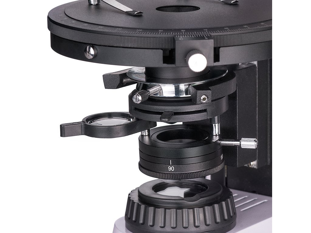 Polarizace je k dispozici pro procházející i odražené světlo. Pro zahájení pozorování v polarizovaném světle se do optické dráhy zavede analyzátor. Navíc se vzájemná poloha analyzátoru a polarizátoru změní jejich otáčením, čímž se také změní úhel polarizace. Kontrast objektů se zvyšuje pomocí kompenzátorů, které se instalují do speciálního slotu v mezilehlém nástavci. Stejný nástavec obsahuje také Bertrandovu čočku, která se používá při konoskopických vyšetřeních.