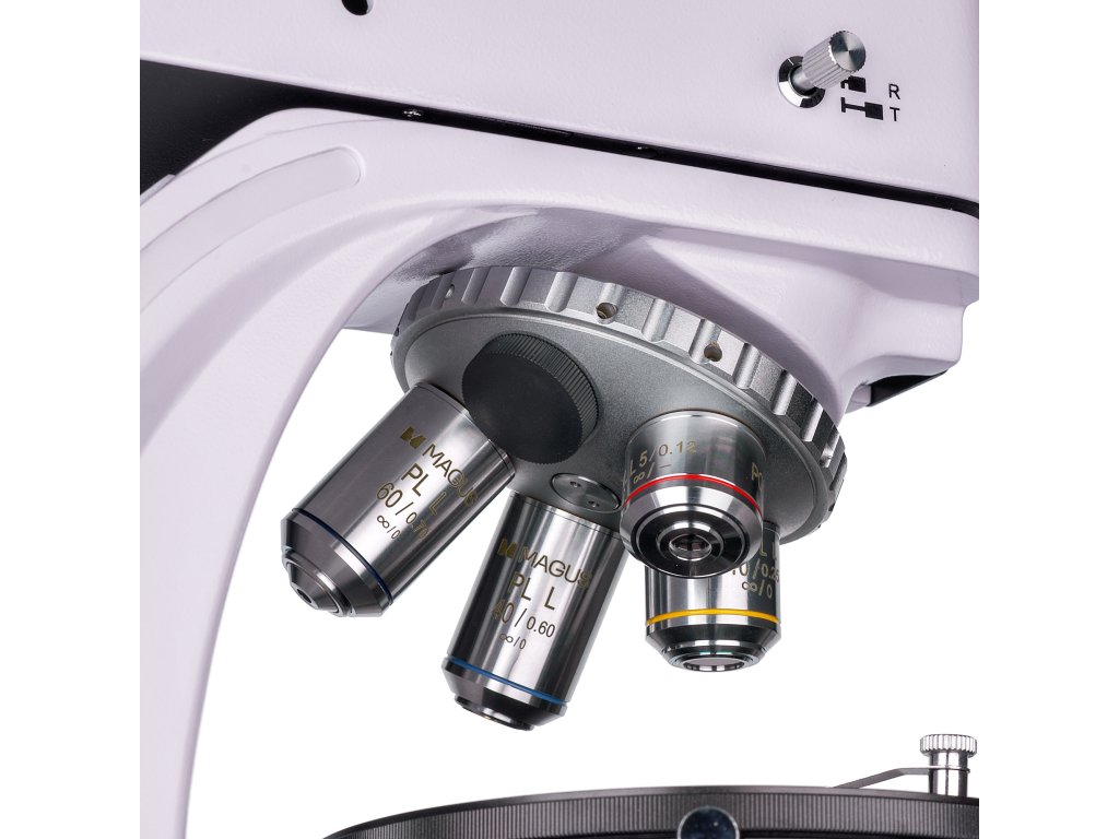 Optické prvky mikroskopu jsou korigovány na nekonečno a jsou bez vnitřního pnutí. Obraz vytvořený objektivy je autentický, bez rušivých odlesků, vysoce kontrastní a detailní. Čočky jsou instalovány v revolverovém nosiči objektivů se sloty vystředěnými k optické ose. V sadě je pět slotů se čtyřmi objektivy; pro získání dalšího zvětšení v rámci rozsahu zvětšení mikroskopu lze nainstalovat jeden další objektiv. Objektivy jsou určeny pro práci se vzorky bez krycích sklíček.