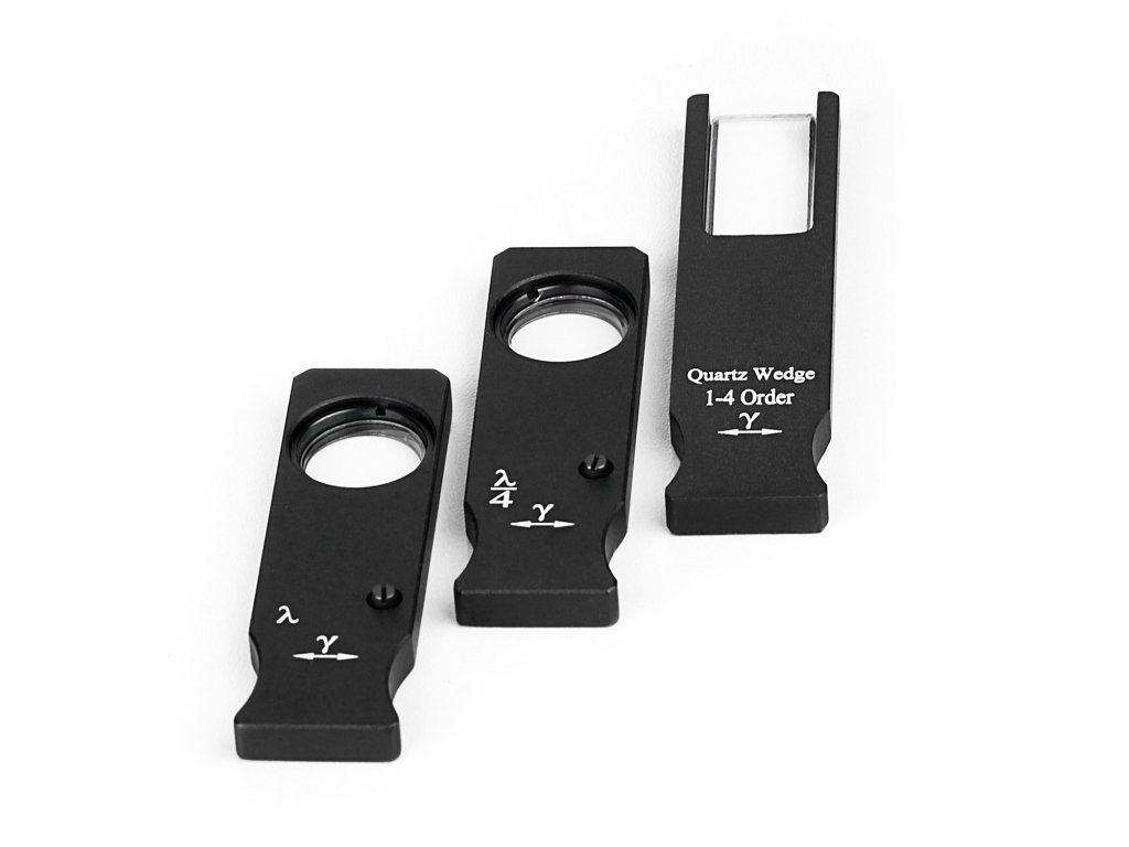 - Polarizace je dosažena pomocí otočného analyzátoru a polarizátoru; mezilehlý nástavec má Bertrandovu čočku a slot pro kompenzátory