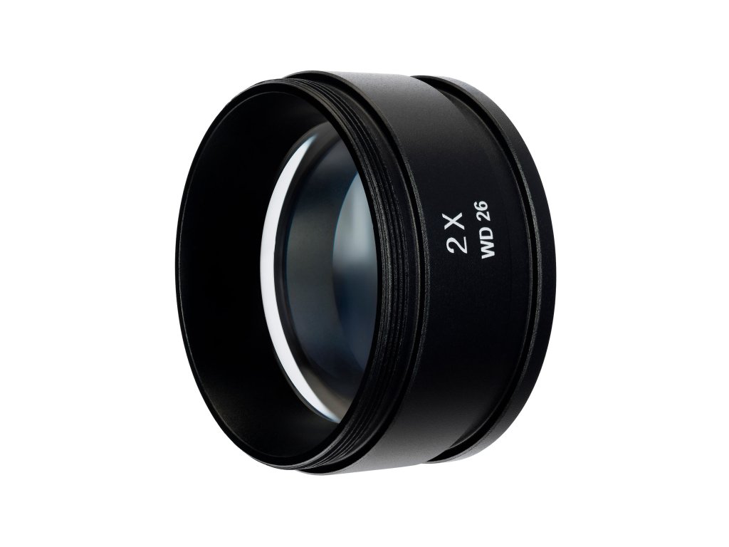 Přídavný objektiv 2x zvětšuje zvětšení stereoskopického mikroskopu a zároveň snižuje pracovní vzdálenost na 26 mm a zorné pole na dvojnásobek ve srovnání s běžným objektivem.