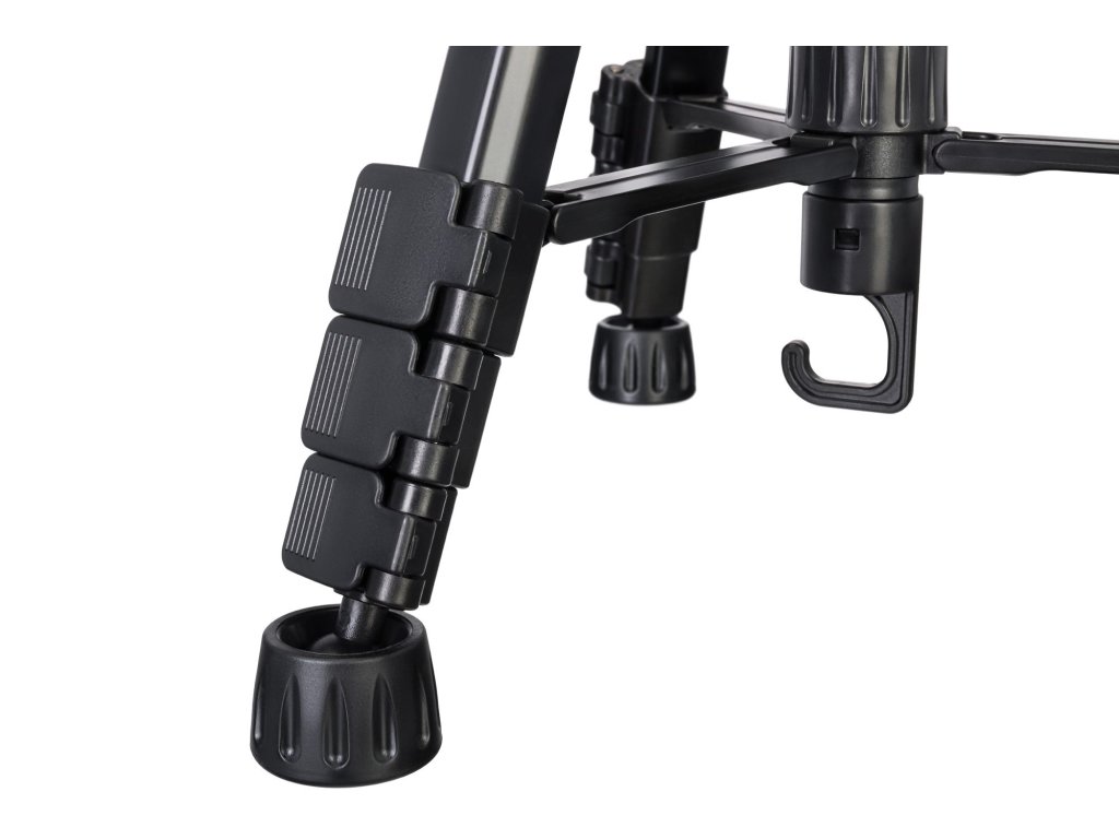 Výšku stativu lze nastavit dvěma způsoby. Buď k rychlému a snadnému nastavení výšky stativu použijete systém flip-lock na každé noze, nebo zvednete nebo spustíte středový sloupek použitím speciálního aretačního knoflíku. Pokud je středový sloupek v nejvyšší poloze, doporučujeme na háček středového sloupku zavěsit závaží, aby byl stativ stabilnější.