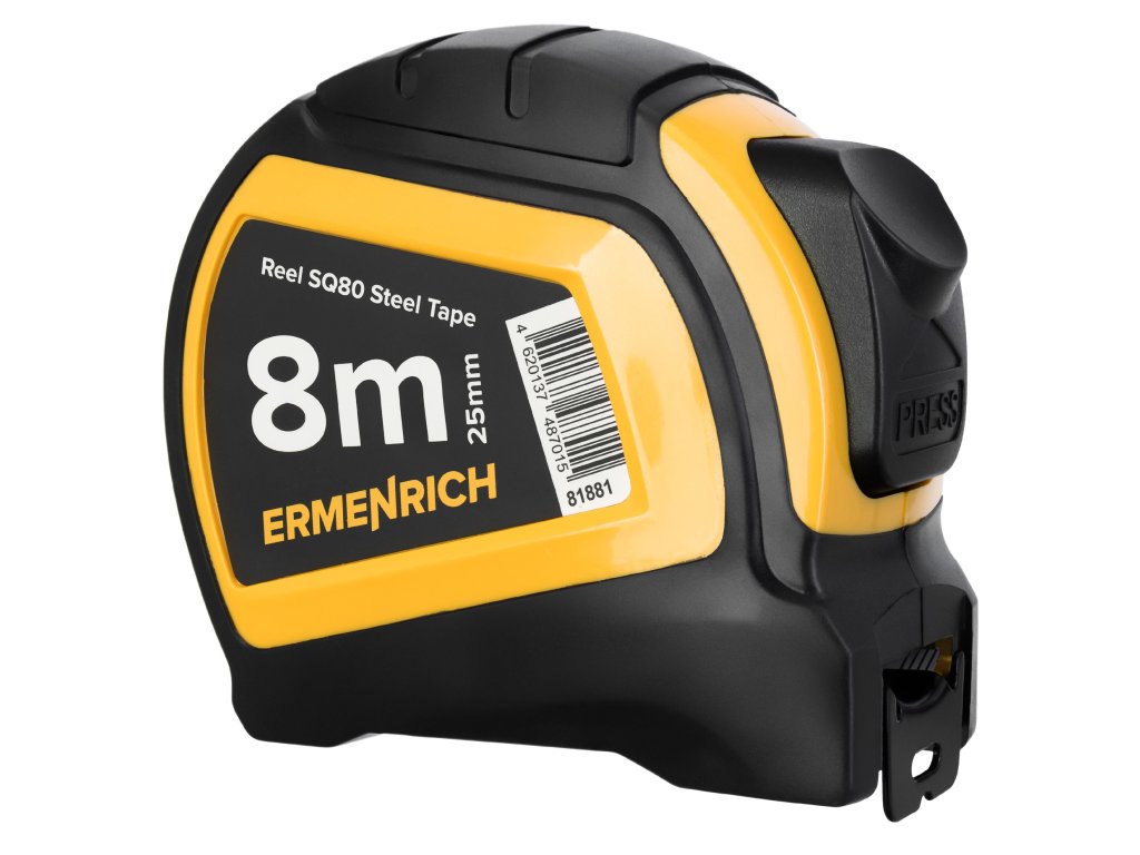 Model Ermenrich Reel SQ80 je vyroben z kartáčované oceli a pouzdro je vyrobeno z vysoce odolného ABS plastu a je pogumované. Díky tomu vám svinovací metr bezpečně padne do ruky a dobře odolává vnějším vlivům. Robustní háček na volném konci svinovacího metru zajišťuje správnou polohu při měření a lze jej použít i pro značení měkkých materiálů. Spona na opasek a řemínek na ruku nabízejí různé možnosti uchycení a přenášení tohoto měřicího nástroje.