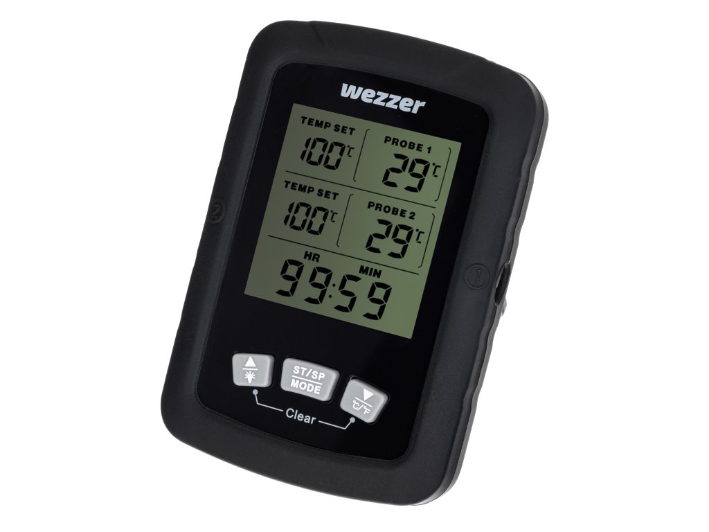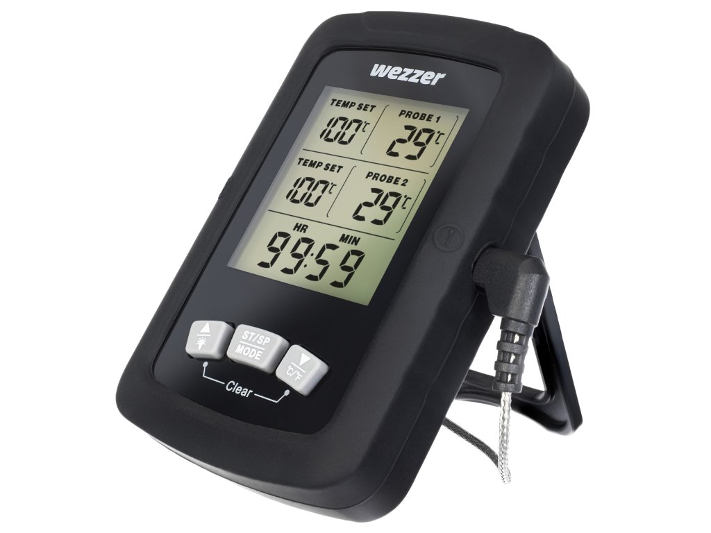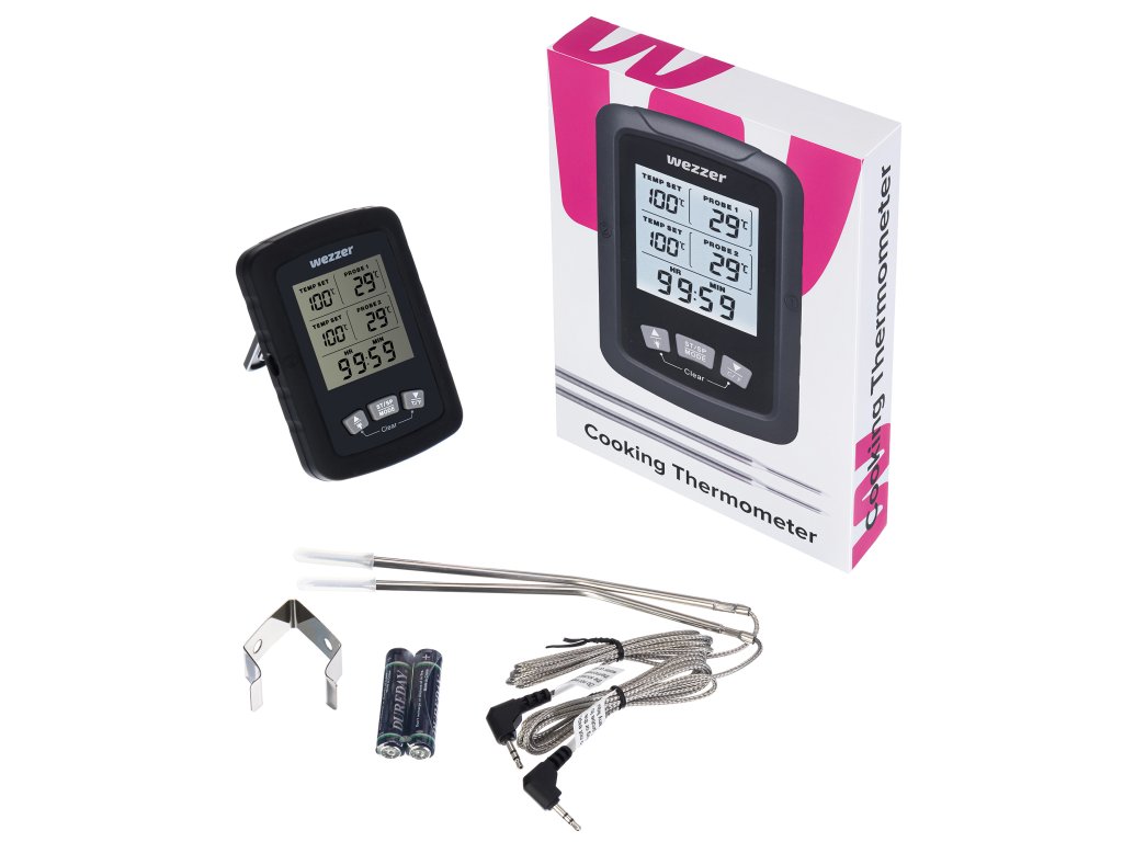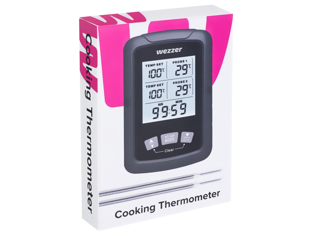 Teploměr Levenhuk Wezzer Cook MT60 s časovačem a dvěma termosondami na ohebných kabelech je velmi užitečným přístrojem pro vaření. Můžete měřit teplotu dvou pokrmů, které se vaří na různých místech současně. Jeden může být například na sporáku a druhý na grilu. Díky možnosti nastavení alarmu překročení teploty vás teploměr může informovat, pokud teplota při pečení překročí požadovanou hodnotu. Tímto způsobem zabráníte připečení masa nebo nadměrnému vysušení pečiva. K dispozici je také vestavěný časovač.