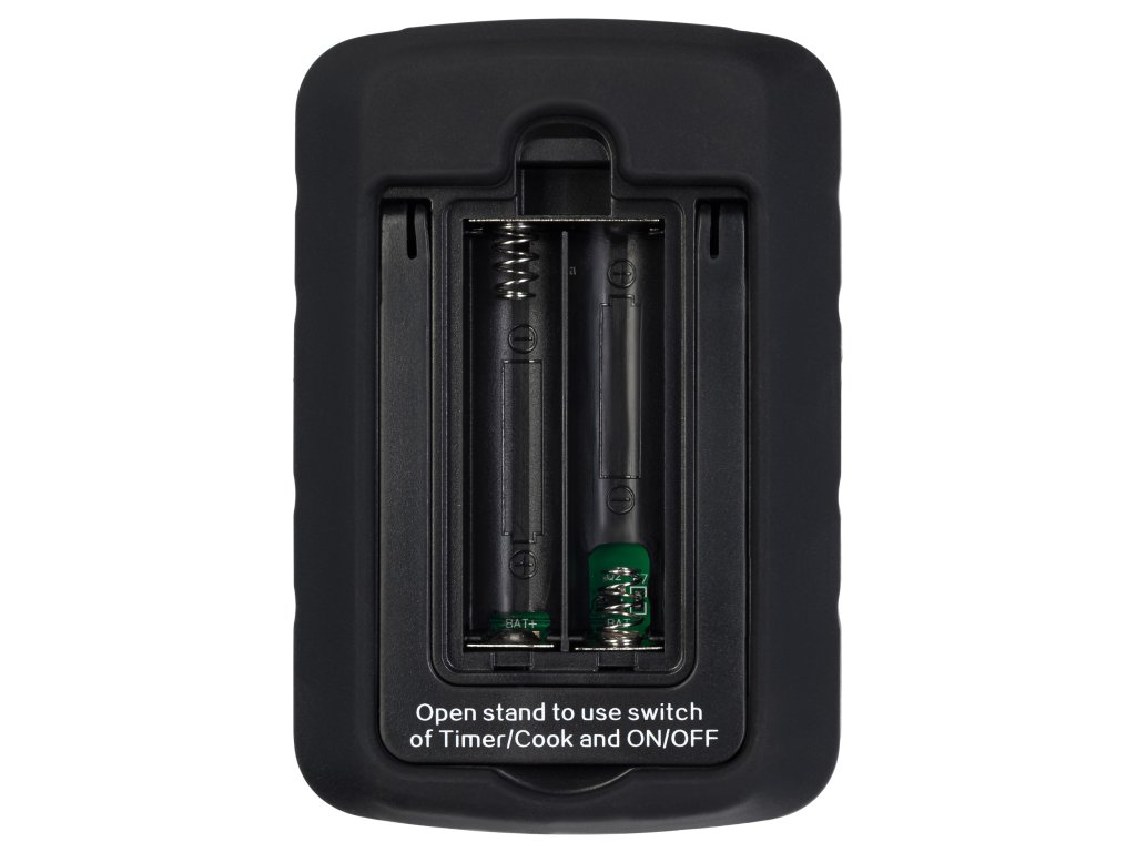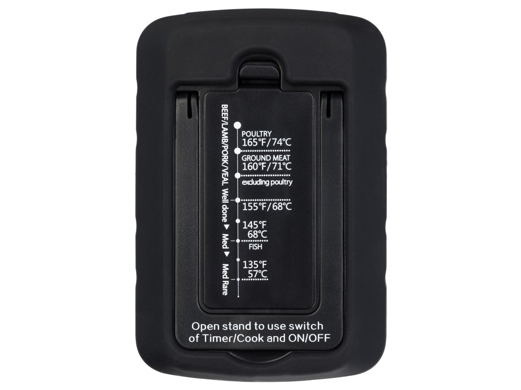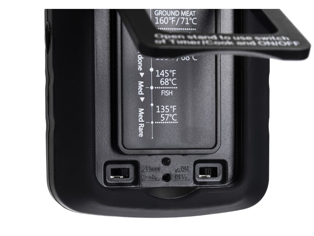 Hodnoty teploty se zobrazují na vestavěné černobílé podsvícené obrazovce. Ovládací prvky jsou umístěny níže: můžete je použít k výběru sondy, kterou chcete použít, a zvolit jednotky měření (°F nebo °C).